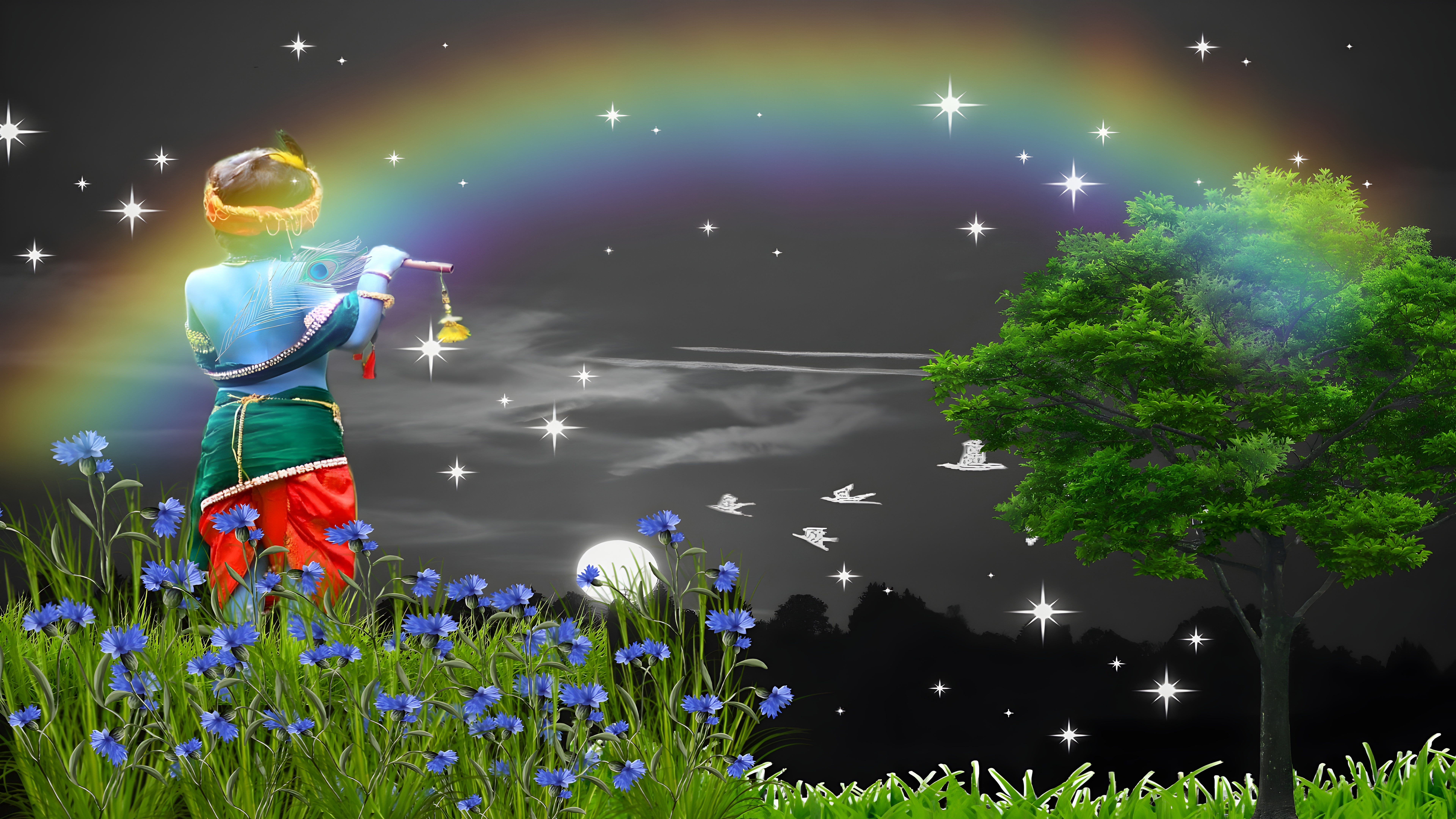 Fantasy Child Rainbow night enchanting HD wallpaper captures a surreal moment where fantasy and nature intertwine. A child-like figure dressed in vibrant traditional attire stands amidst a glowing field of blue flowers, holding a bell and gazing at a radiant rainbow that arcs across a star-filled night sky. The scene is illuminated by a full moon and dotted with white birds in flight, adding a sense of serenity and wonder.