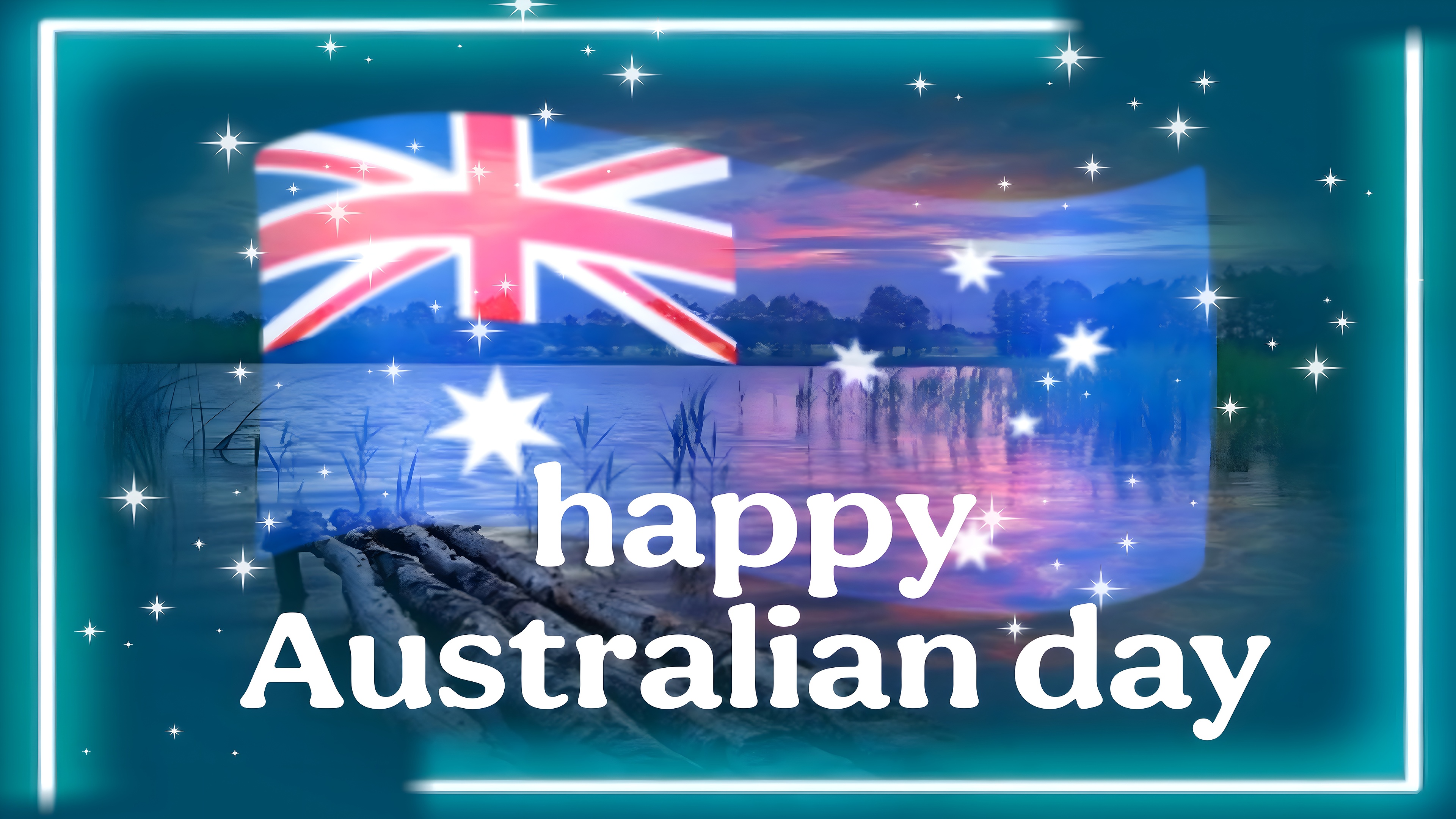 The wallpaper’s artistic style combines photographic realism with subtle digital enhancements, such as the glowing stars and the soft neon border framing the image. The deep teal and navy blue tones create a calming atmosphere, while the soft pink hues of the sunset add warmth and depth. The rustic wooden dock introduces a natural texture that contrasts beautifully with the smooth water surface. This blend of elements conveys a mood of peaceful celebration and national pride, making it an inspiring choice for Australian Day enthusiasts and lovers of serene nature scenes. The overlay of the Australian flag adds a cultural symbol that enhances the wallpaper’s festive theme without overpowering the tranquil setting.