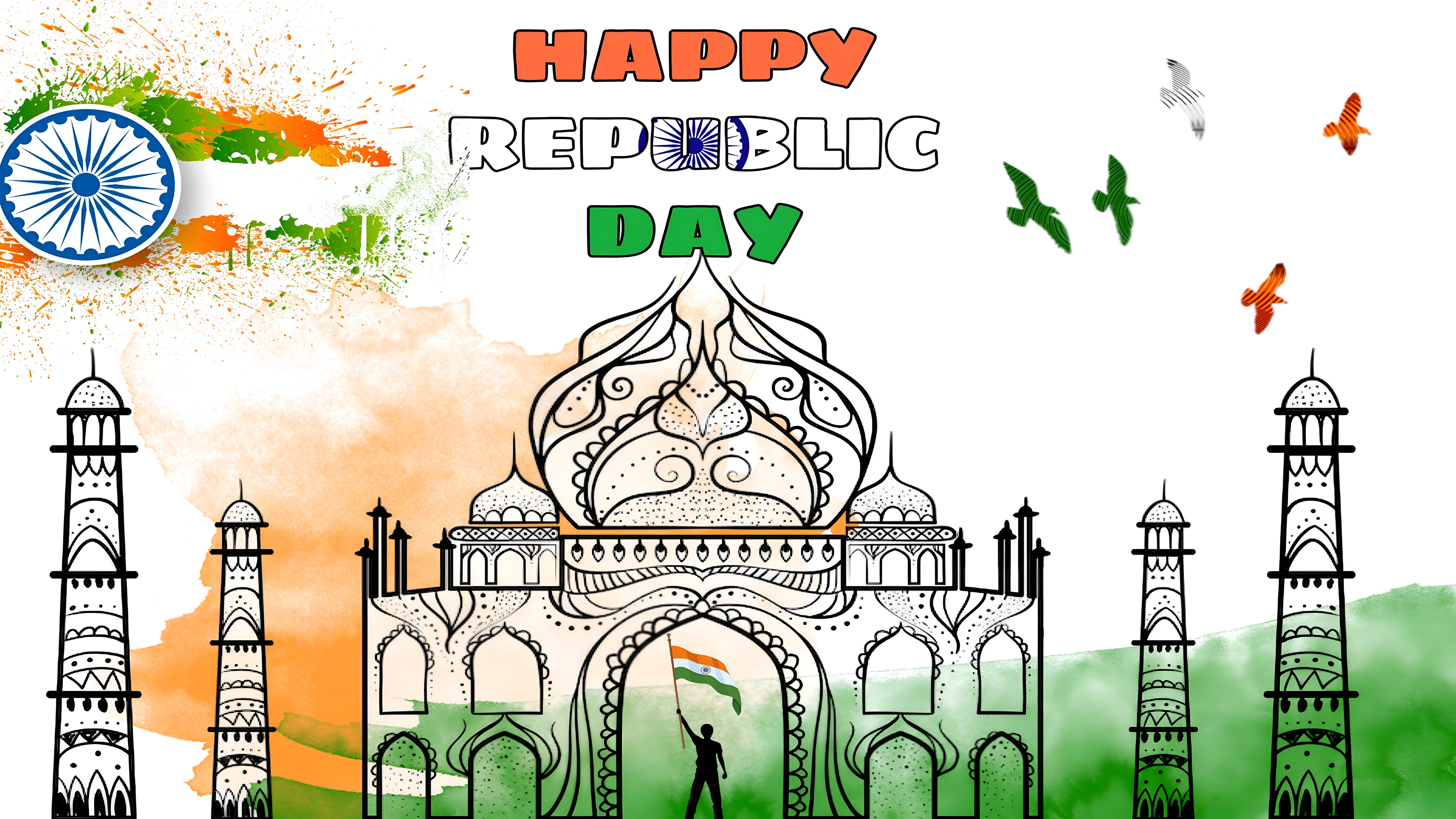 This high-resolution wallpaper combines traditional Indian motifs with modern graphic art, creating a festive and uplifting atmosphere. The presence of flying birds in tricolor hues adds a sense of freedom and celebration, enhancing the overall mood of national pride. The design's clean white background allows the vibrant colors and intricate line art to stand out sharply, making it an ideal desktop background or mobile wallpaper for Republic Day festivities.