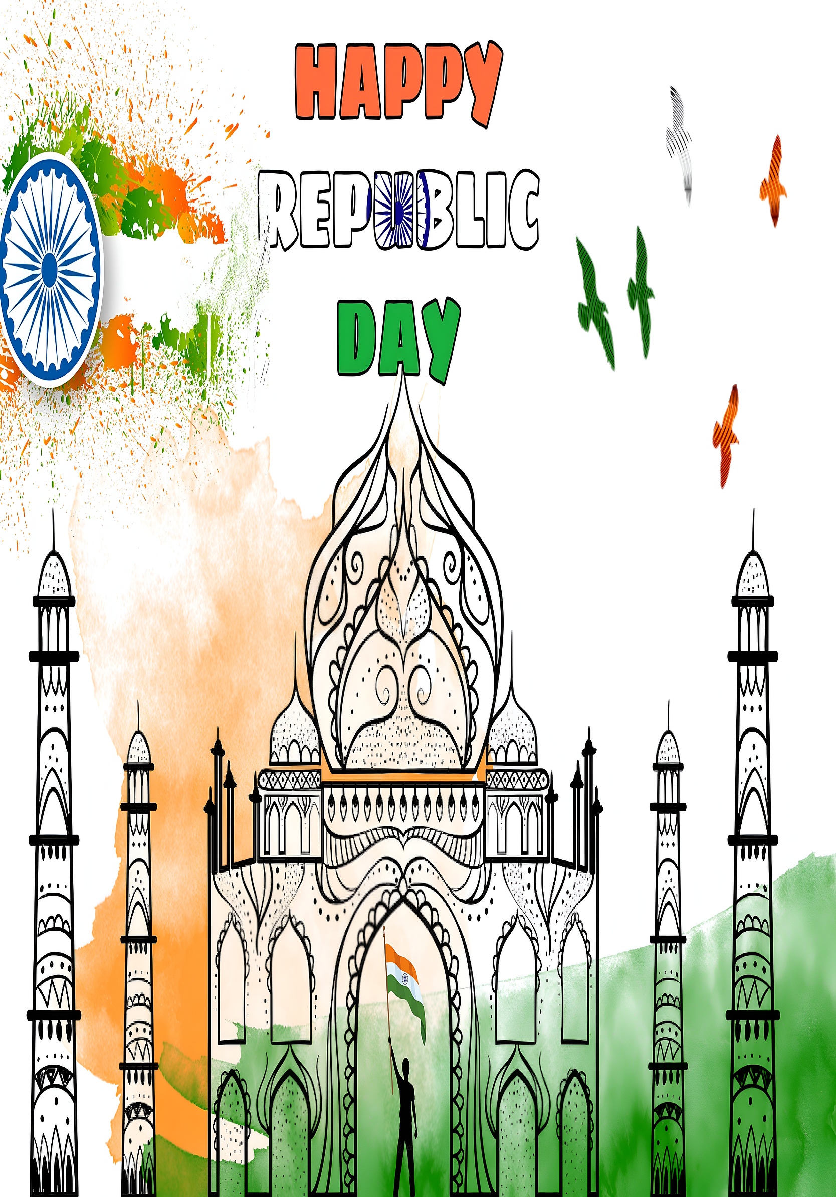 This vibrant Happy Republic Day India Art wallpaper beautifully captures the spirit of Indian patriotism through a creative blend of symbolic elements and national colors. The main subject is a stylized sketch of an iconic Indian monument, intricately designed with artistic patterns and surrounded by tall minarets. A silhouette of a person holding the Indian tricolor flag stands prominently at the center archway, symbolizing pride and unity. The background features a watercolor splash effect in saffron orange, white, and India green, representing the Indian flag's tri-color palette. Above the monument, the bold text "HAPPY REPUBLIC DAY" is displayed with the word "REPUBLIC" creatively incorporating the Ashoka Chakra within the letters, adding a unique cultural touch.