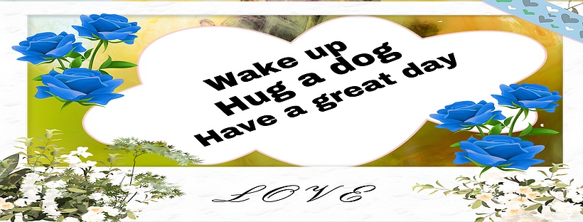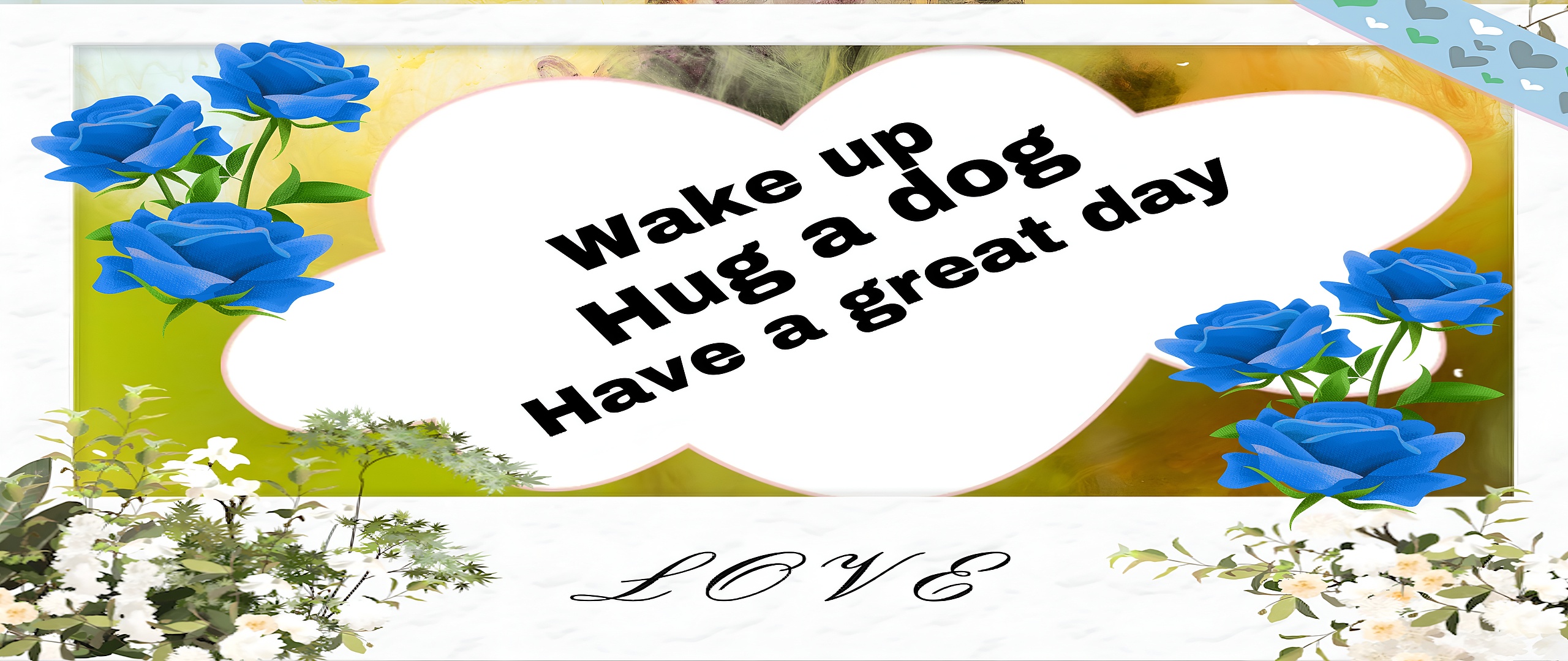This stunning HD wallpaper features a heart-shaped white frame prominently centered against a warm yellow and green textured background. Inside the heart, a bold, uplifting message reads, "Wake up Hug a dog Have a great day," delivering a positive and motivational vibe perfect for daily inspiration. Surrounding the heart are vivid blue roses on both sides, adding a rich splash of color and a romantic floral touch. Below, delicate white flowers and leafy greenery create a natural, serene base that balances the composition beautifully.