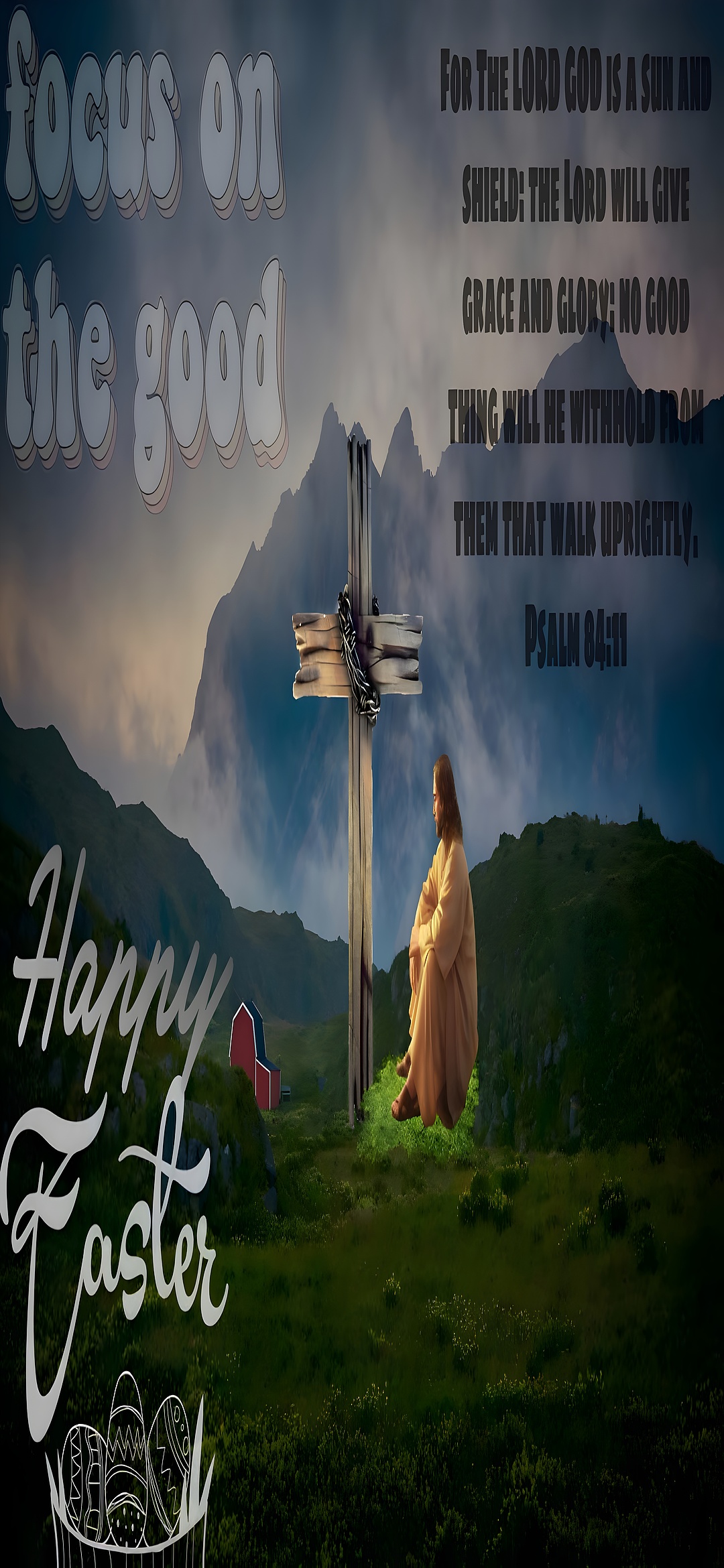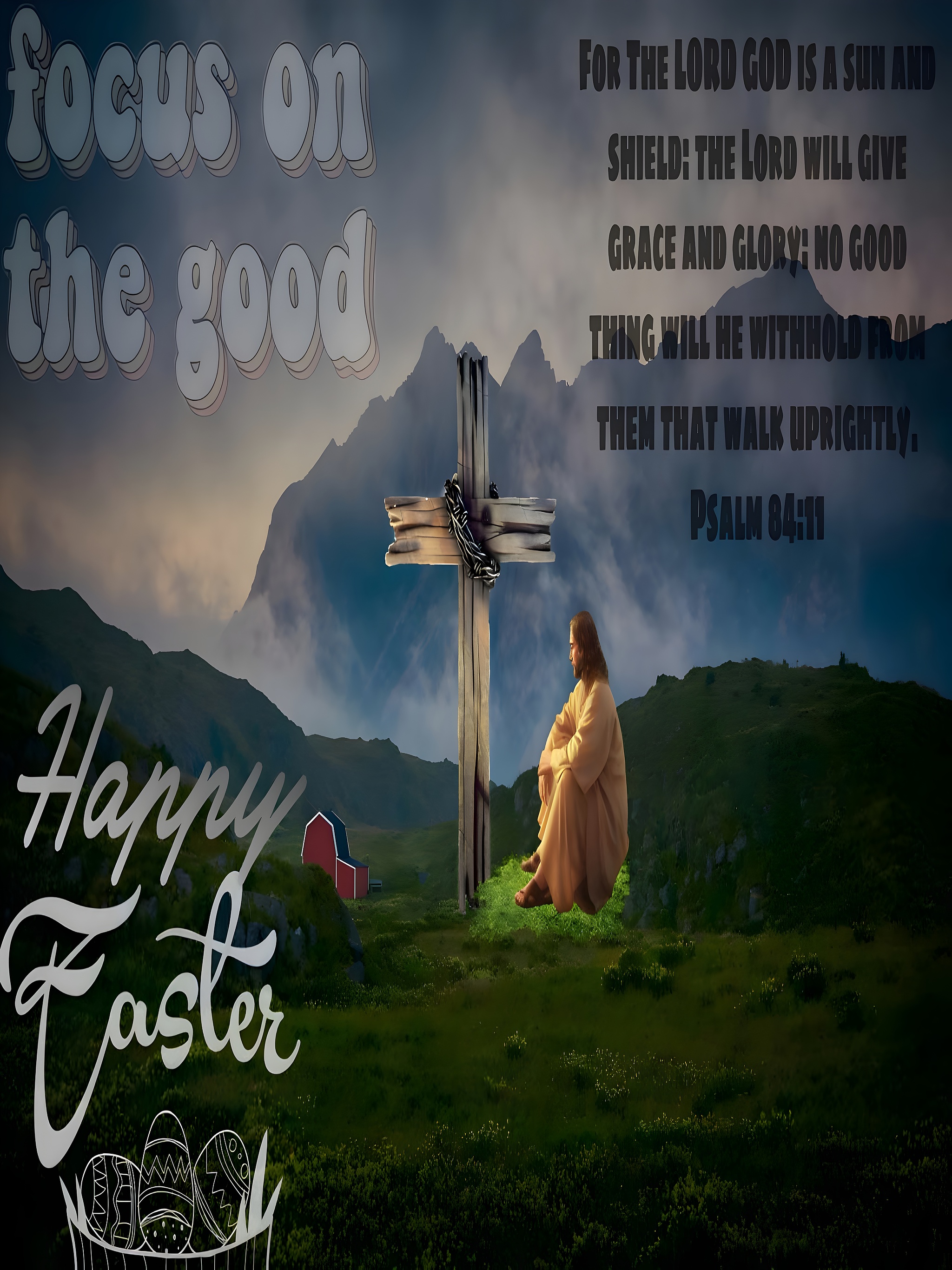 This wallpaper is enriched with Christian symbolism, including the wooden cross, the crown of thorns, and the contemplative figure, which together evoke themes of sacrifice, grace, and hope central to Easter celebrations. The overlay text includes an uplifting Bible verse from Psalm 84:11, "For the LORD God is a sun and shield: the LORD will give grace and glory: no good thing will he withhold from them that walk uprightly," reinforcing the spiritual message. The phrase "focus on the good" and the festive "Happy Easter" greeting with decorative Easter eggs add a modern, encouraging touch to the classic religious scene. Such elements make this wallpaper ideal for those looking to combine faith-based inspiration with seasonal celebration in their digital art collection.