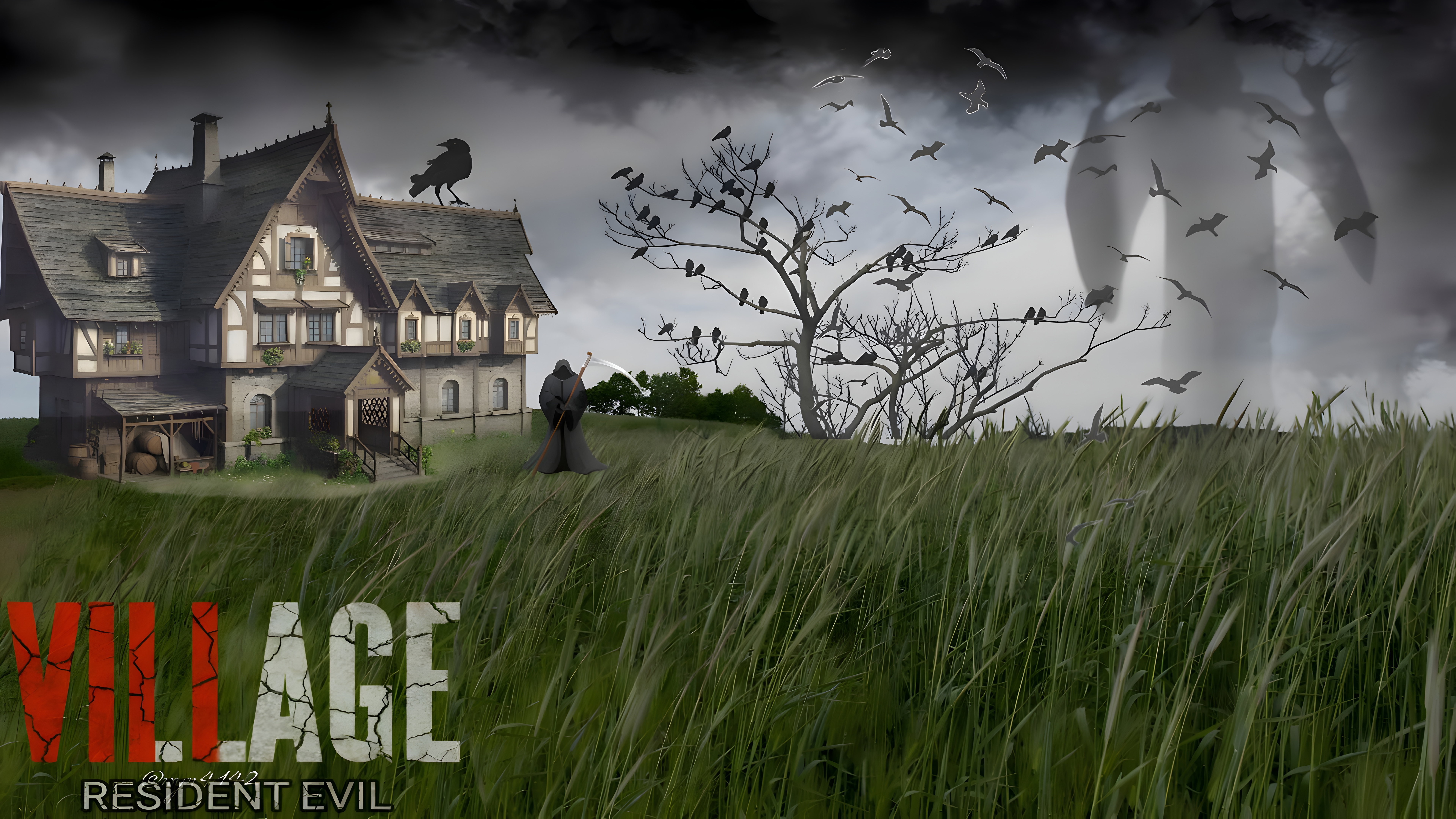 This wallpaper blends gothic architectural design with dark fantasy horror elements, creating a visually compelling scene. The lighting is soft and diffused, with the cloudy sky casting a muted glow that highlights the mansion’s detailed textures and the wispy grass. The use of silhouettes for the birds and the grim reaper figure adds a dramatic contrast against the foggy background, emphasizing the wallpaper’s spooky and mysterious vibe. The cracked and weathered text "VILLAGE RESIDENT EVIL" in the corner reinforces the horror theme without distracting from the main imagery. This wallpaper’s 16:9 aspect ratio adapts well to widescreen monitors and modern smartphones, offering a premium HD experience for fans of horror games and dark art.