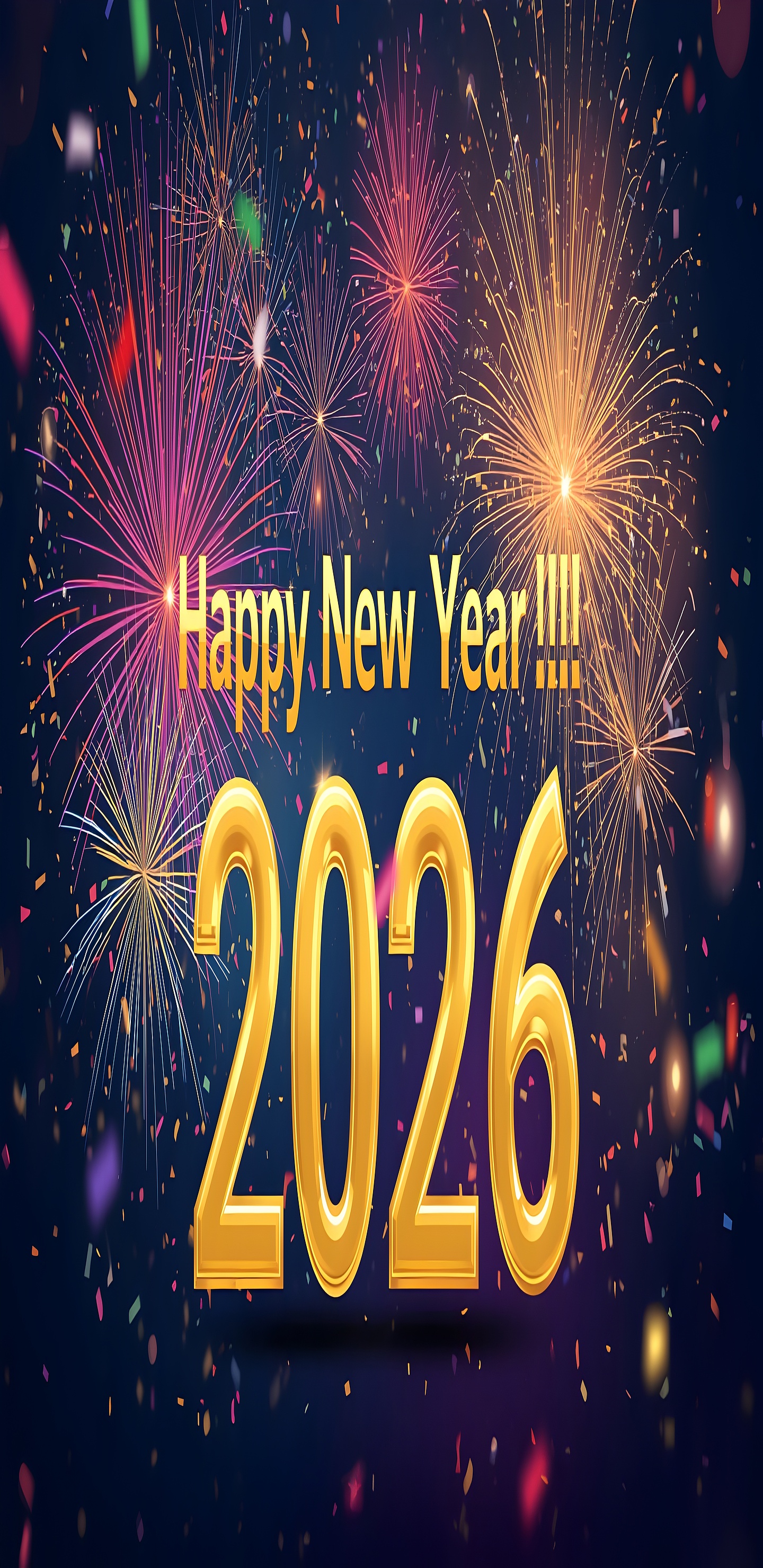 Celebrate the arrival of 2026 with this stunning New Year fireworks celebration wallpaper, perfectly crafted to bring vibrant energy and festive spirit to your desktop or mobile screen. The image features a dazzling display of colorful fireworks bursting across a deep night sky, illuminating the scene with radiant hues of golden yellow, vibrant red, bright purple, and deep blue. At the center, bold golden text proudly announces “Happy New Year !!!! 2026,” creating a joyful and optimistic atmosphere that captures the excitement of welcoming a fresh new year.