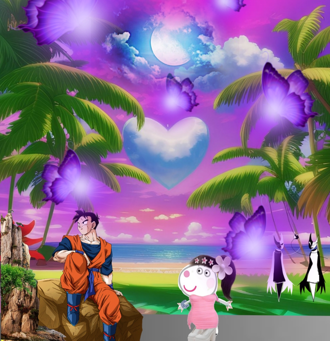 In the foreground, Goku from Dragon Ball sits contemplatively on a rock, while a cheerful cartoon character in pink adds a playful contrast. Floating abstract figures enhance the dreamlike atmosphere, making this wallpaper a unique fusion of anime, fantasy, and childlike wonder.