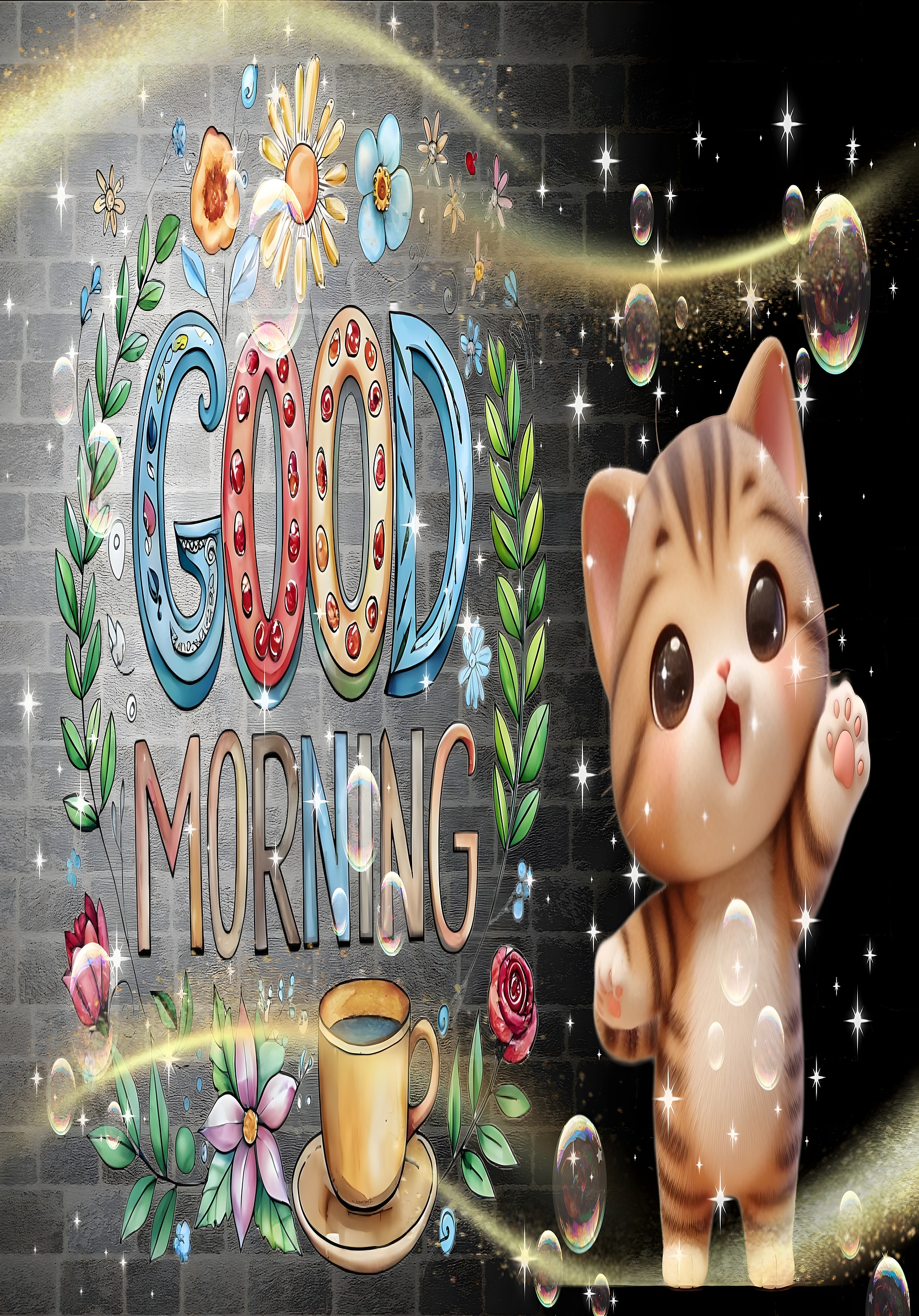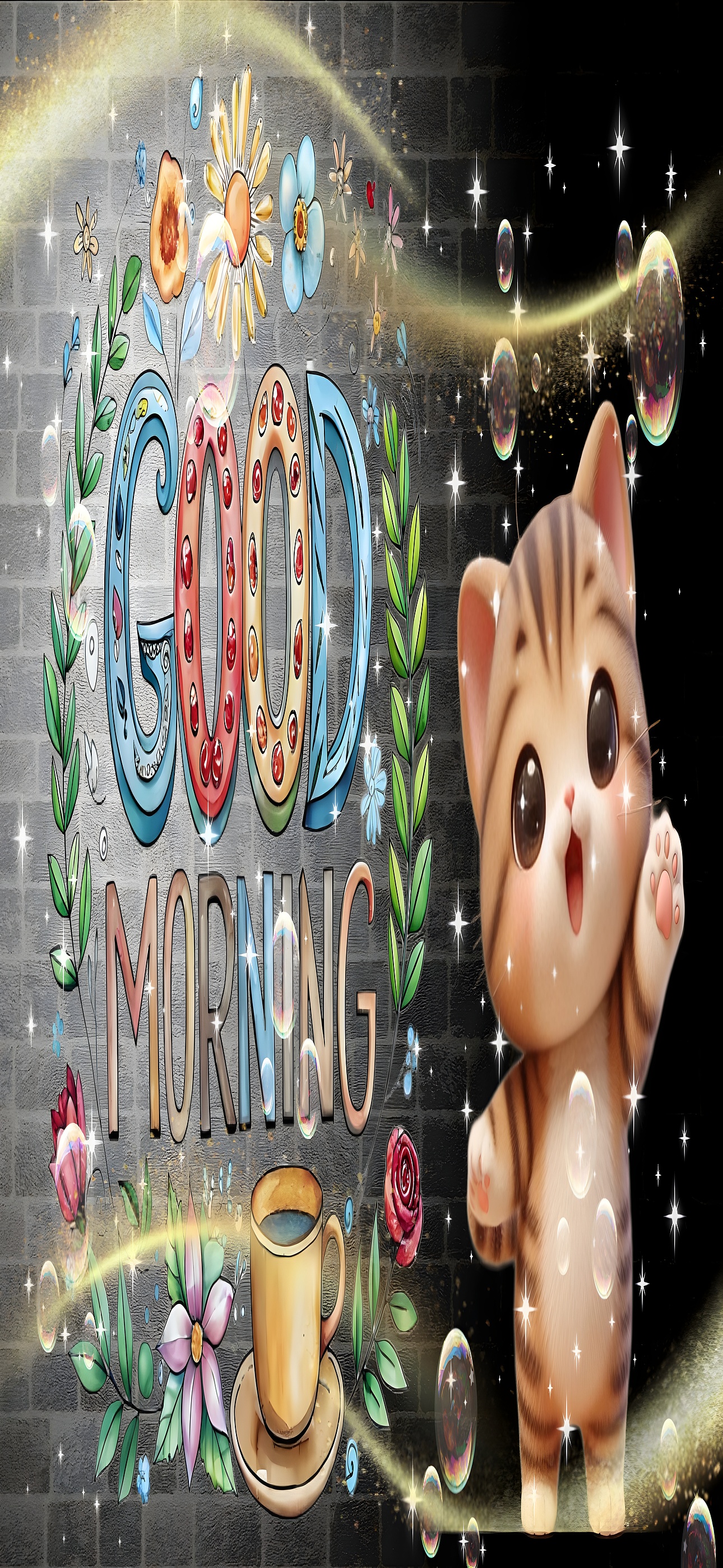 This delightful HD wallpaper features an irresistibly cute animated kitten alongside a vibrant "Good Morning" greeting, making it a perfect start to anyone’s day. The main subject is a chubby, wide-eyed tabby cat with soft beige and warm peach fur tones, waving its paw joyfully amidst sparkling bubbles and twinkling stars. The colorful lettering of "Good Morning" is beautifully decorated with floral and leaf motifs, blending pastel blues, light greens, and soft peach hues that create a fresh and uplifting atmosphere. This wallpaper’s artistic style combines whimsical cartoon charm with a touch of magical realism, enhanced by glowing sparkles and translucent bubbles that float gracefully across the scene.