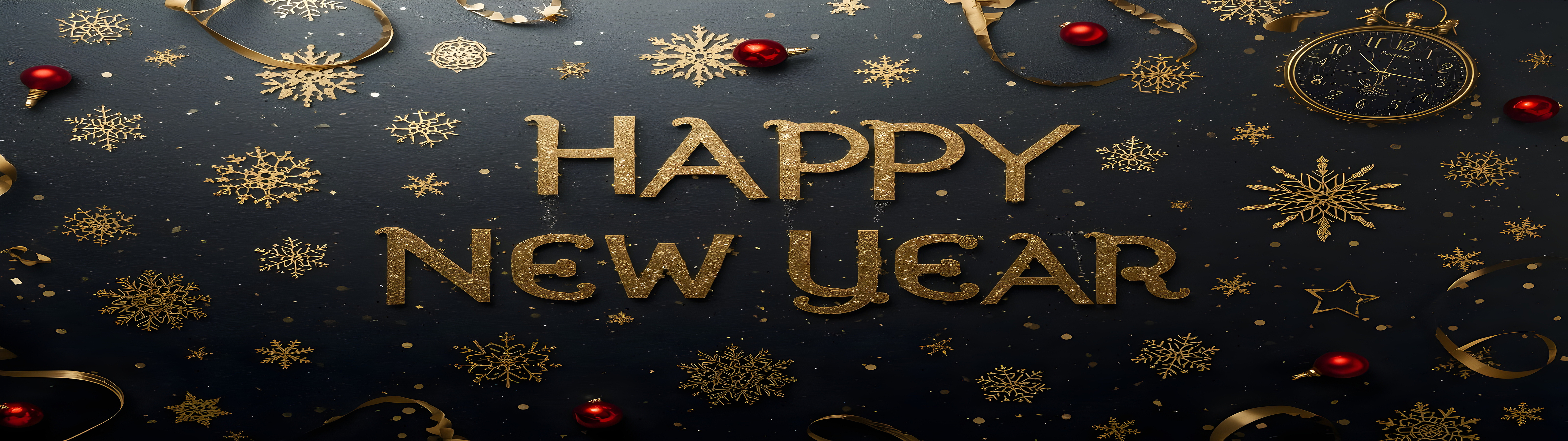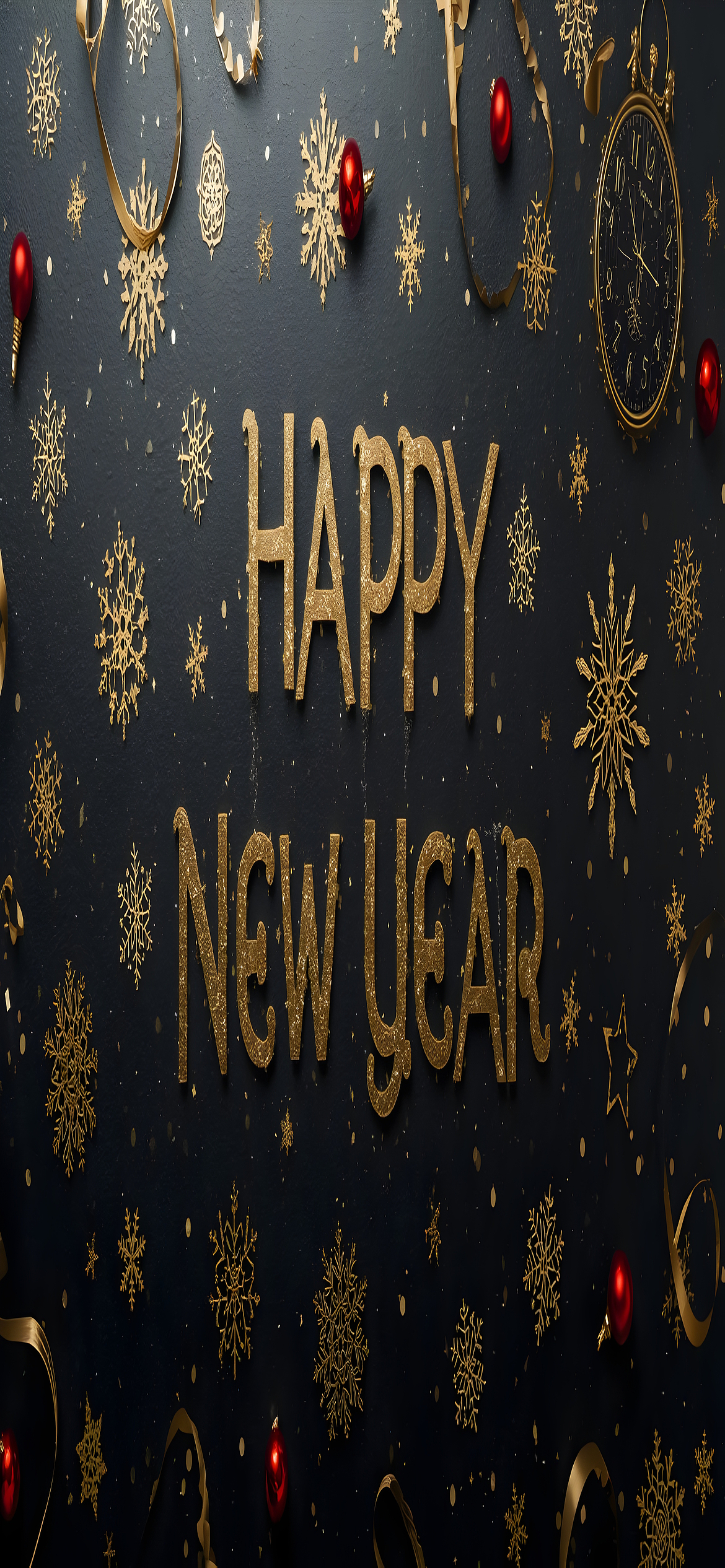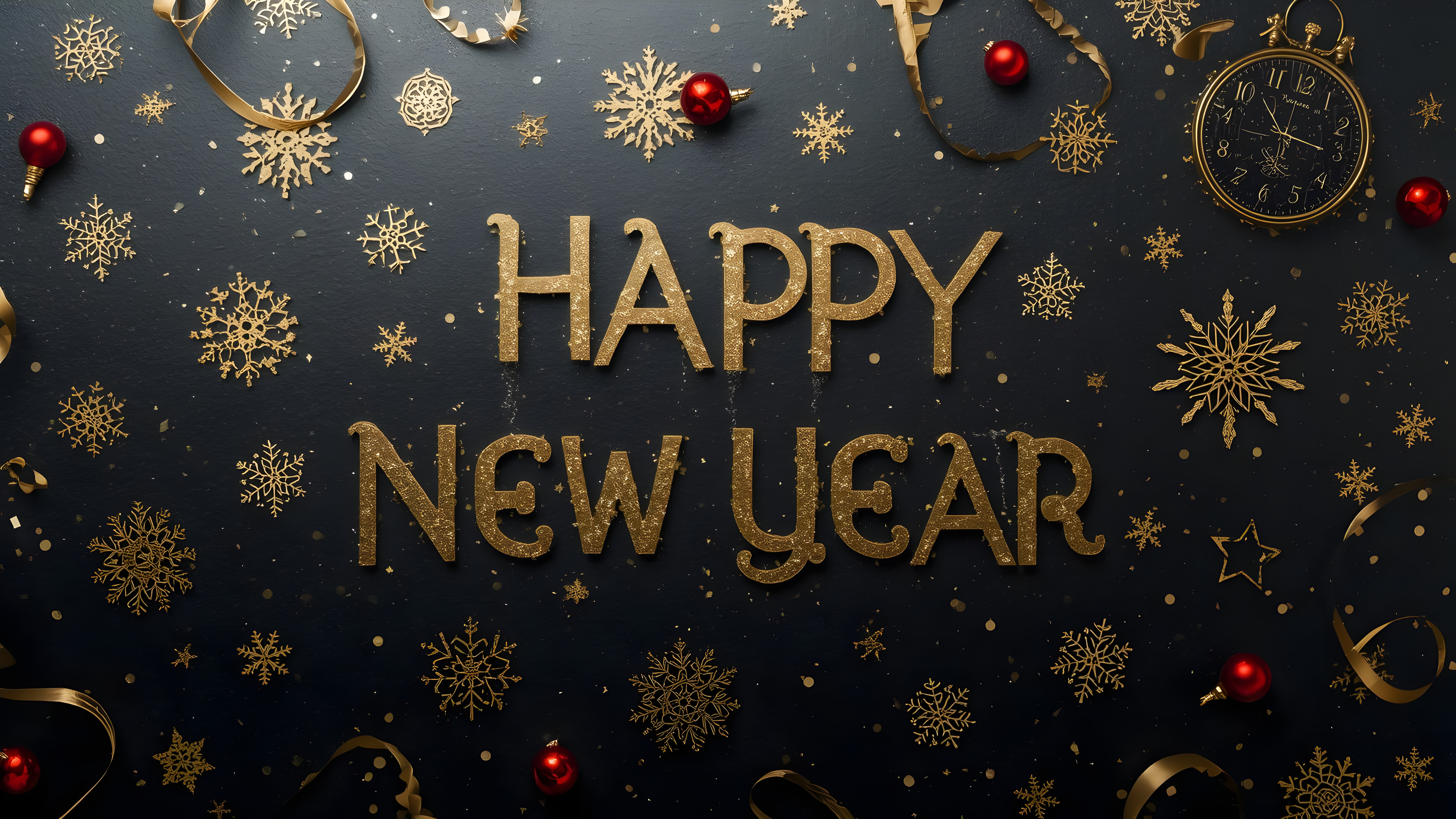 This wallpaper features a striking contrast between the metallic gold text and the rich black background, which makes the "HAPPY NEW YEAR" message stand out vividly. The gold snowflakes scattered around add a delicate decorative touch, while the small red baubles introduce a subtle pop of color that enriches the composition. The texture appears smooth with a slight sheen, emphasizing the luxurious feel. This combination of colors and textures creates an inviting and festive atmosphere that works beautifully as a high-definition background for desktops, laptops, tablets, and smartphones alike.