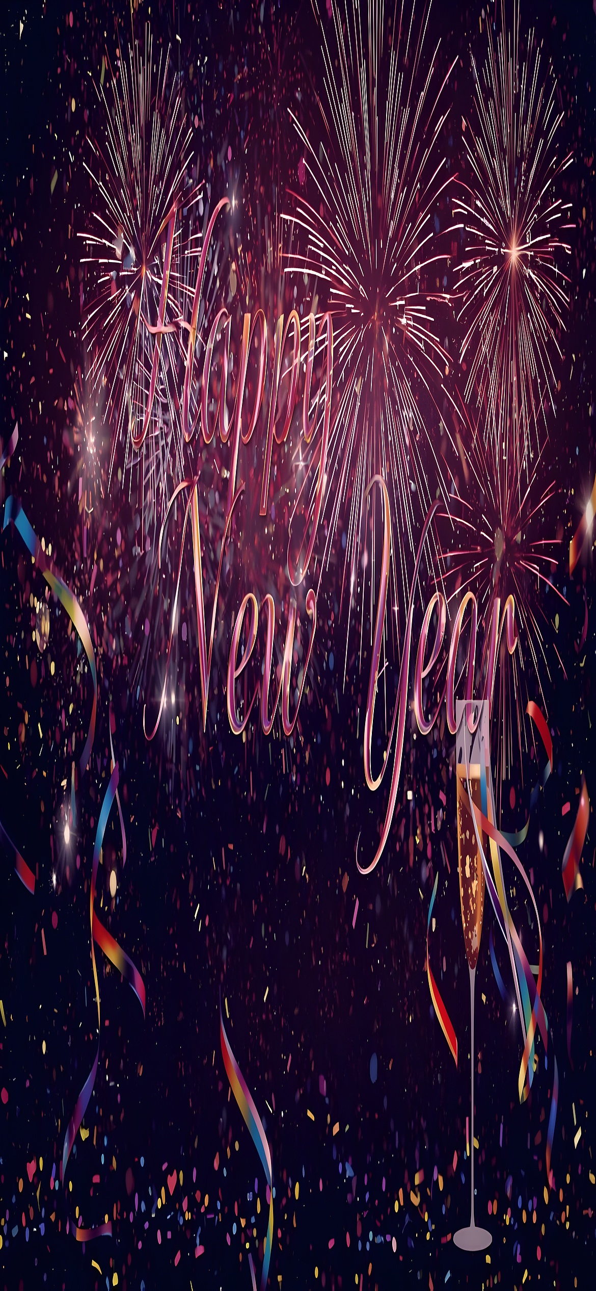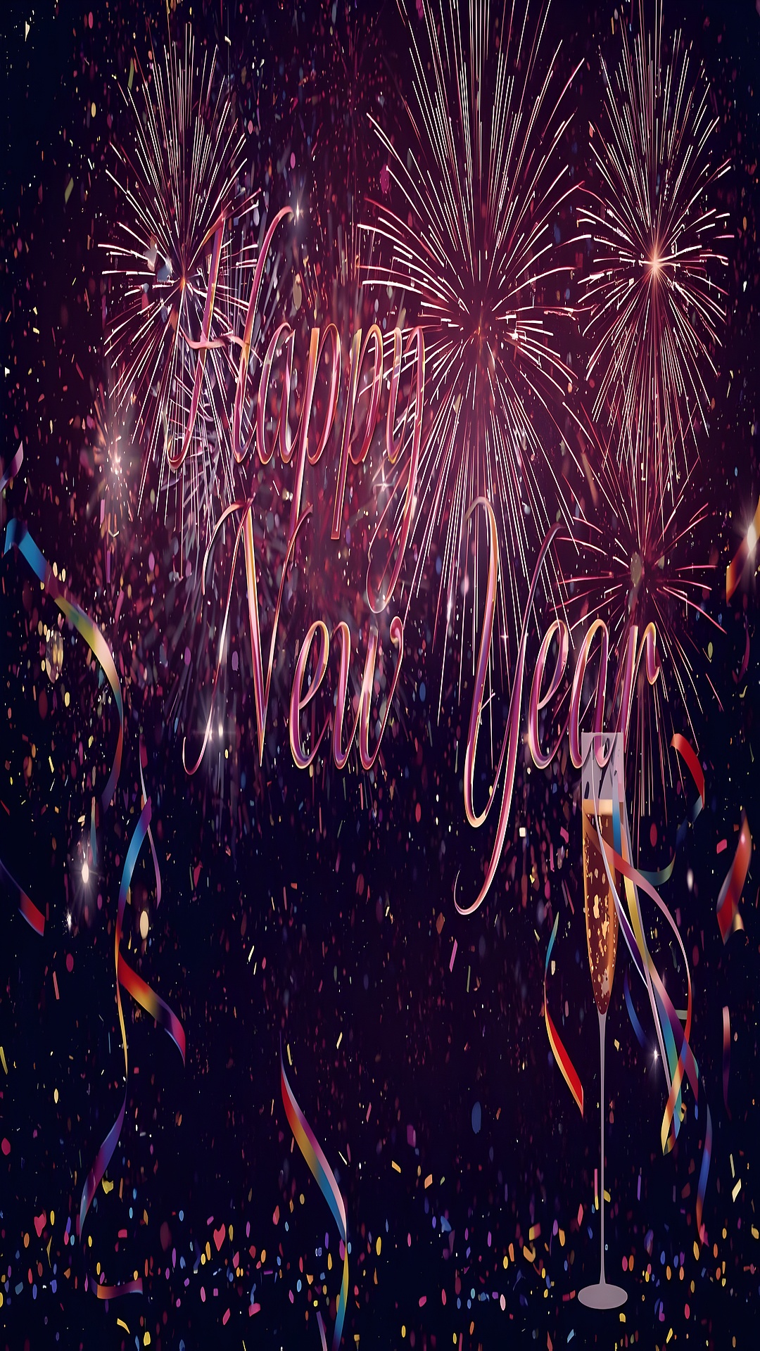 The artistic style of this wallpaper combines realistic fireworks photography with a touch of digital enhancement to emphasize the glowing sparks and shimmering light trails. The deep purple night sky serves as a perfect canvas for the bright gold and fiery red bursts, while the sparkling white highlights add a magical glow. The elegant "Happy New Year" text, seamlessly integrated into the scene, enhances the celebratory theme without overpowering the visual spectacle. This wallpaper conveys a mood of joy, hope, and celebration, making it an excellent choice for holiday-themed wall art and seasonal decorations on digital devices.