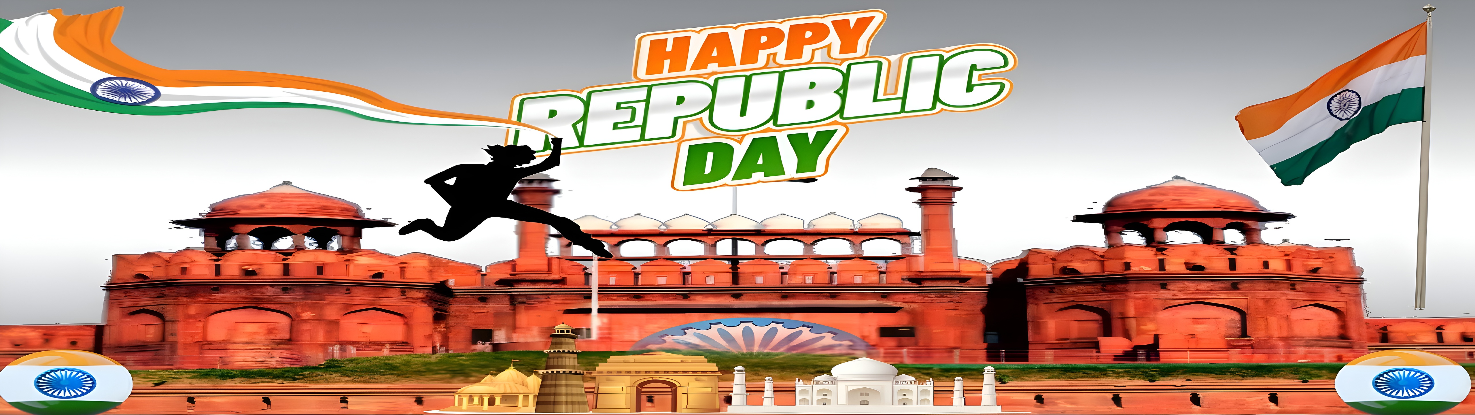 This vibrant Happy Republic Day India Celebration wallpaper beautifully captures the essence of Indian patriotism and cultural pride. Dominated by the iconic Red Fort in Delhi, the image showcases the historic red sandstone architecture that stands as a symbol of India's rich heritage. The foreground features miniature artistic representations of famous Indian landmarks like the Taj Mahal, India Gate, and Qutub Minar, blending history and culture seamlessly. The Indian tricolor flag waves proudly on the right, while a dynamic silhouette of a person holding the flag in motion adds a lively, celebratory energy to the scene. The text "HAPPY REPUBLIC DAY" boldly crowns the composition in bright saffron, white, and green, echoing the colors of the national flag.