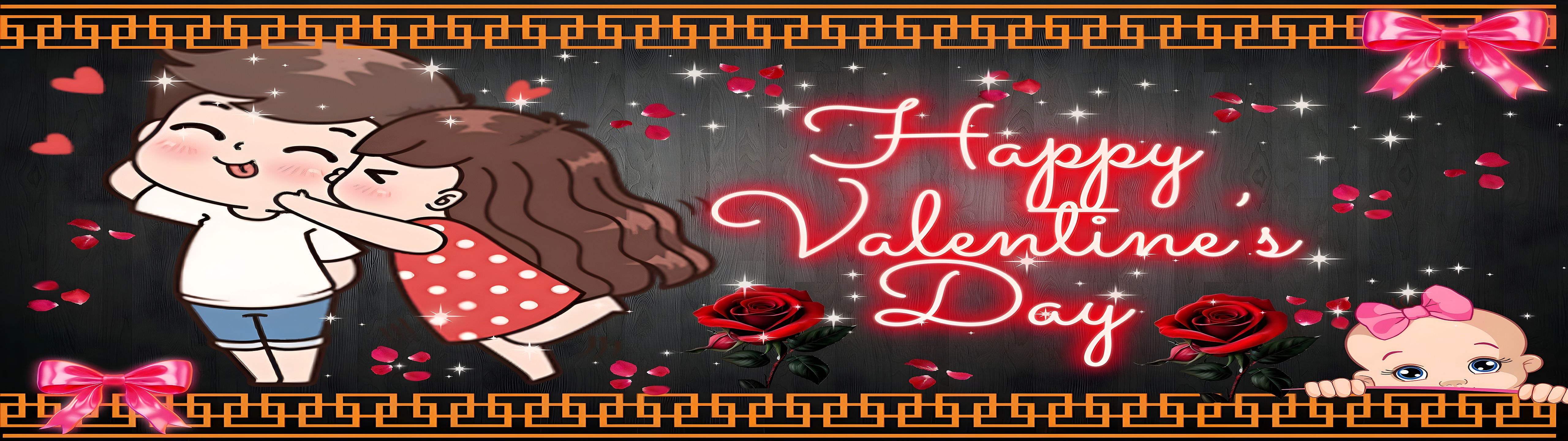 This high-resolution wallpaper blends soft pink highlights from the bows and blushes with deep red accents from the roses and petals, complemented by warm brown tones in the characters' hair and a dark charcoal backdrop. The neon-style glowing text "Happy Valentine's Day" shines brightly in elegant script, adding a modern, celebratory touch. The decorative orange geometric border frames the scene beautifully, making this wallpaper perfect for anyone looking to brighten their desktop or mobile screen with a sweet Valentine’s Day theme.