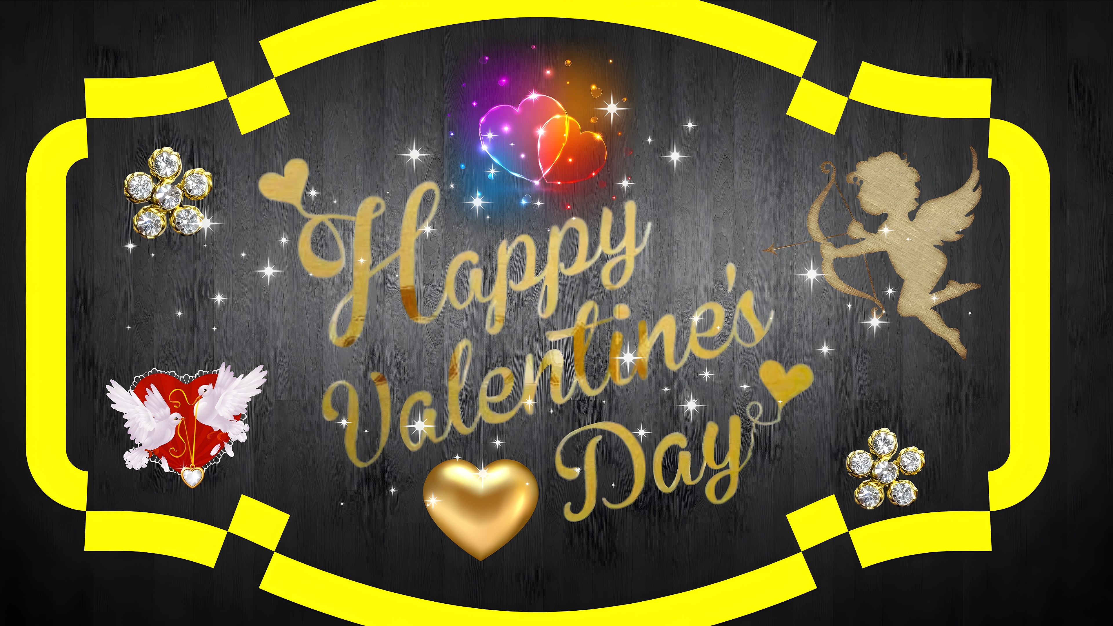 Celebrate love with this stunning Happy Valentines Day Gold Art wallpaper, designed to bring warmth and elegance to your digital space. The main subject features a beautifully scripted golden "Happy Valentines Day" message, surrounded by charming romantic elements such as a golden heart, a cupid silhouette aiming an arrow, and two white doves perched on a red heart. This composition is set against a sleek, deep black wood-textured background that adds a luxurious and sophisticated touch. Bright yellow decorative framing elegantly encloses the scene, creating a vibrant contrast that enhances the overall visual appeal.