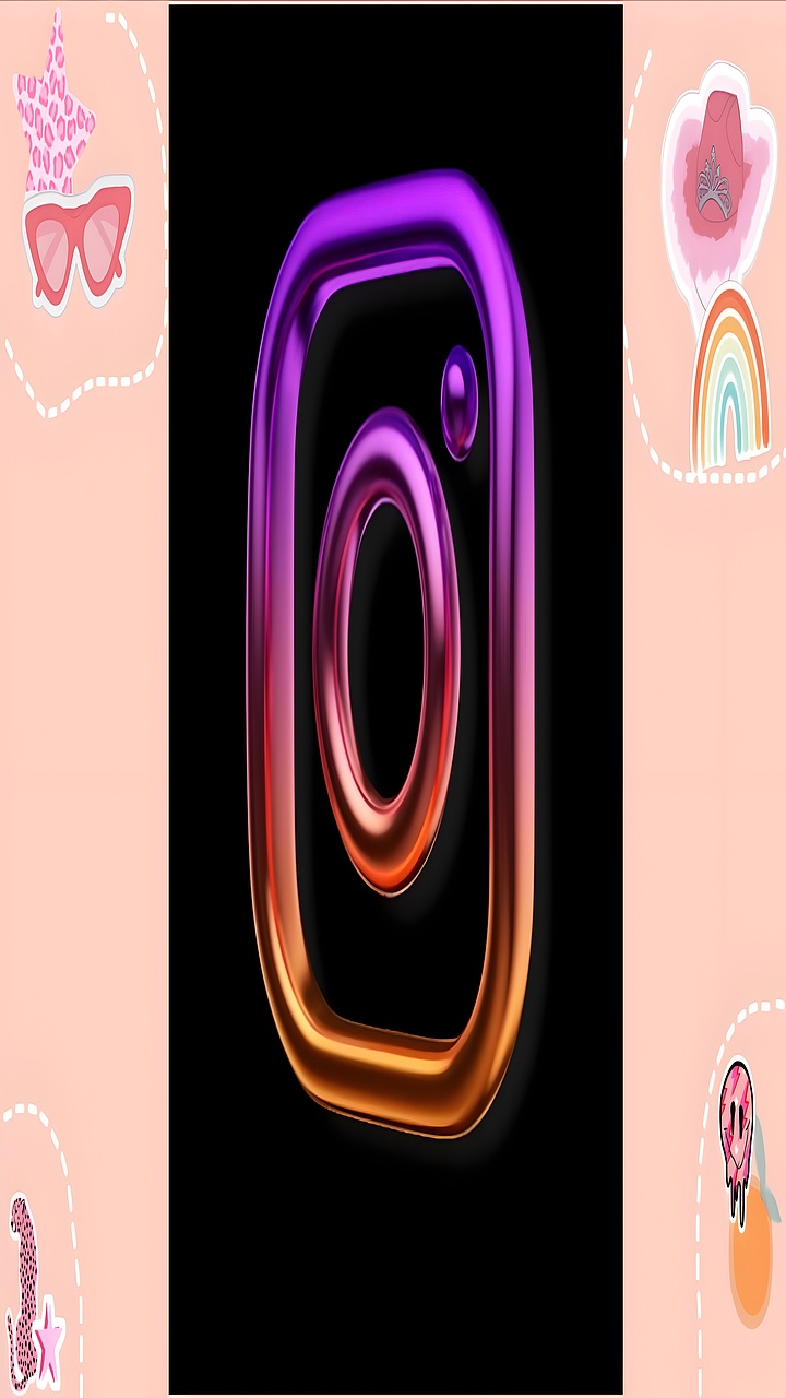 Instagram Summer Icons HD wallpaper features a stunning 3D rendering of the iconic Instagram logo, set against a sleek black background. The logo itself glows with a vibrant gradient, transitioning from deep purple to warm orange, capturing the energetic essence of the platform. Surrounding the central icon is a whimsical peach-toned border adorned with cheerful summer-themed illustrations—pink sunglasses, a starfish, rainbow, hat, spoon, and seahorse—each adding a touch of fun and personality.
