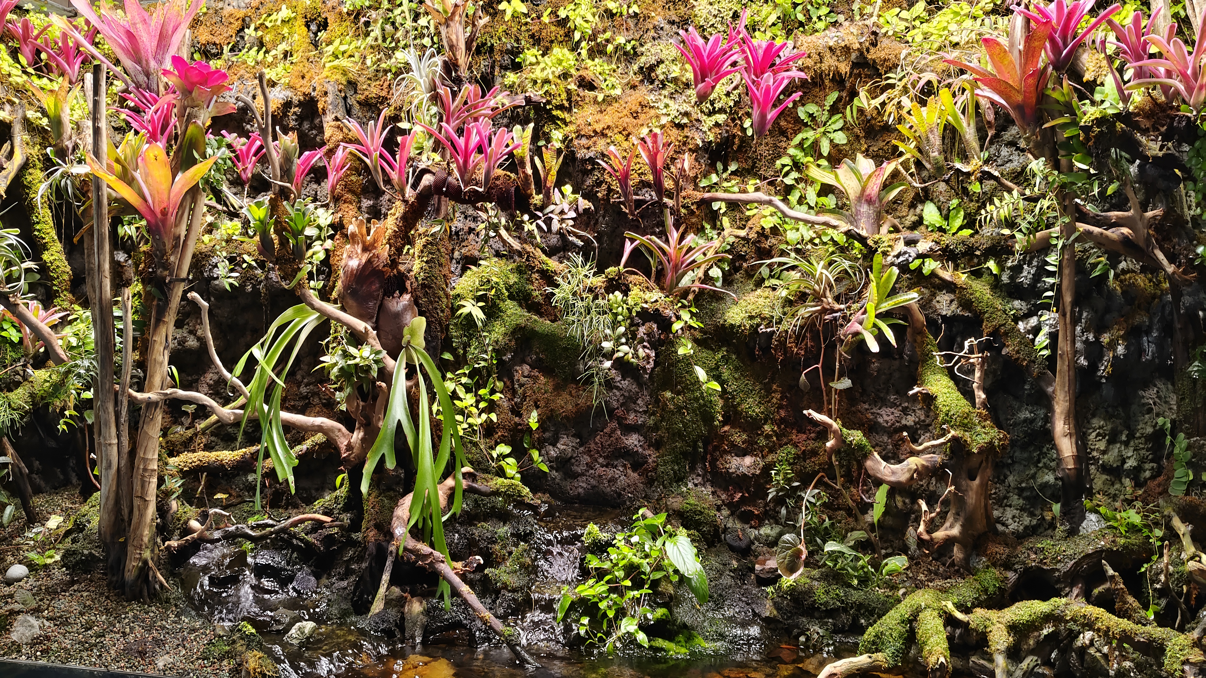The deep green hues of the moss and ferns blend harmoniously with the earthy brown soil and the vibrant pink leaves, creating a balanced color palette that is both soothing and invigorating. This wallpaper is an excellent choice for those looking to bring a touch of natural beauty and tranquility to their digital devices, offering a premium HD wallpaper experience that highlights the intricate details and vibrant colors of tropical forest vegetation.