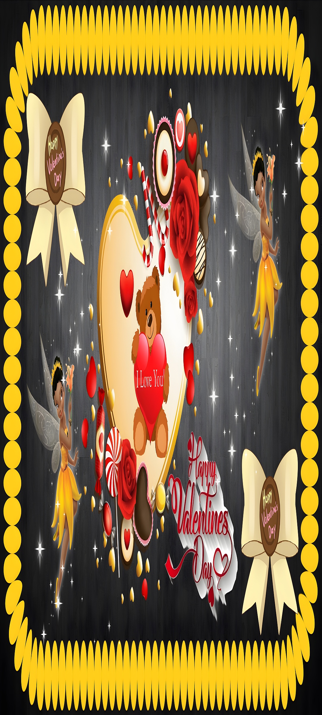 This high-resolution wallpaper showcases a blend of soft textures and vivid colors, with the warm yellow of the fairies' dresses and the bright red of roses and hearts creating a lively yet tender palette. The dark charcoal wood grain background provides a subtle, elegant contrast that highlights the central elements without overpowering them. Sparkling light effects scattered across the scene add depth and a sense of enchantment, making this image ideal for those seeking a romantic desktop background or mobile wallpaper with a touch of fantasy. The heart-shaped candies, roses, and teddy bear symbolize love and sweetness, making this wallpaper a perfect choice for Valentine's Day celebrations or romantic-themed digital wall art.