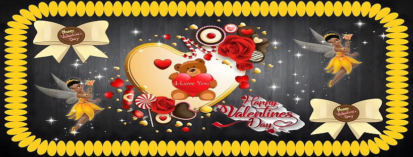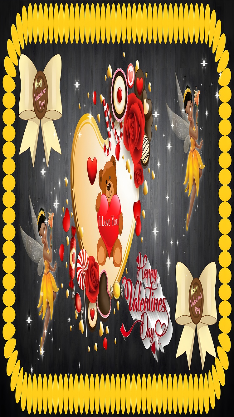 This Valentine's Day Romantic HD Wallpaper beautifully captures the essence of love and affection through a vibrant and enchanting digital composition. At the center, a cute teddy bear holds a bright red heart inscribed with "I Love You," surrounded by an assortment of heart-shaped candies, red roses, and festive sweets. The wallpaper's warm yellow and deep red hues contrast elegantly against a dark charcoal wooden background, creating a visually striking and heartwarming scene. Delicate sparkles scattered throughout the image add a magical touch, enhancing the romantic atmosphere.