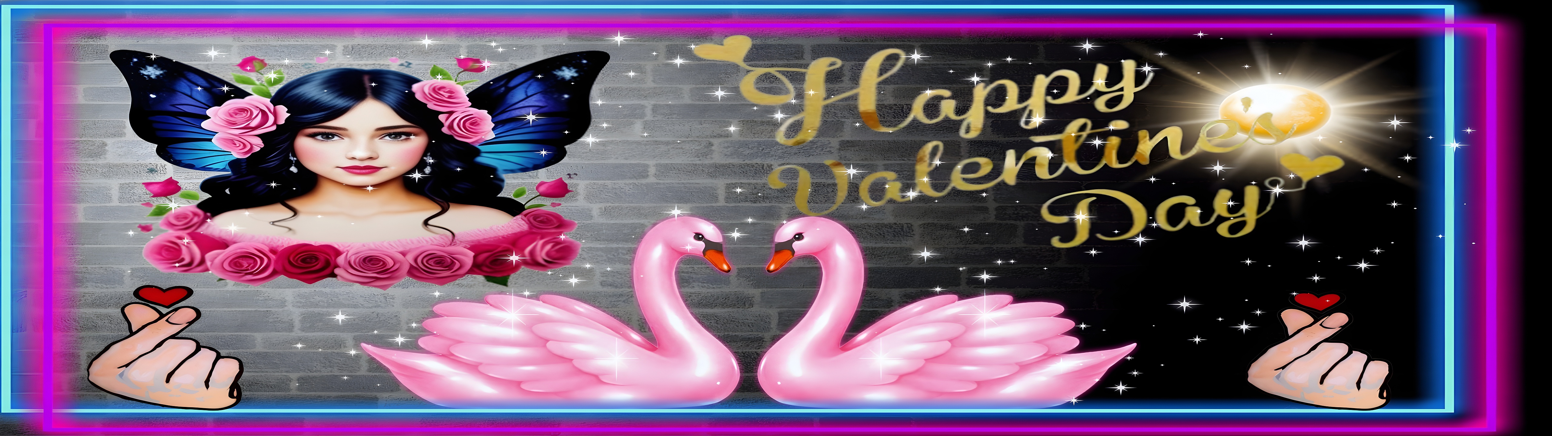 This Valentine's Day Romantic HD Wallpaper beautifully captures the essence of love and enchantment through its vivid and imaginative design. The main subject is a digitally illustrated young woman with striking blue butterfly wings adorned with delicate pink roses, creating a fairy-like, ethereal presence. Her dark hair contrasts elegantly with the vibrant pink roses framing her shoulders, while sparkling star-like effects add a magical glow to the entire composition. Below her, two glossy pink swans face each other, their wings shimmering with soft highlights, symbolizing love and unity. The background features a textured gray brick wall that provides a subtle, neutral contrast to the bright colors, enhancing the overall romantic atmosphere.