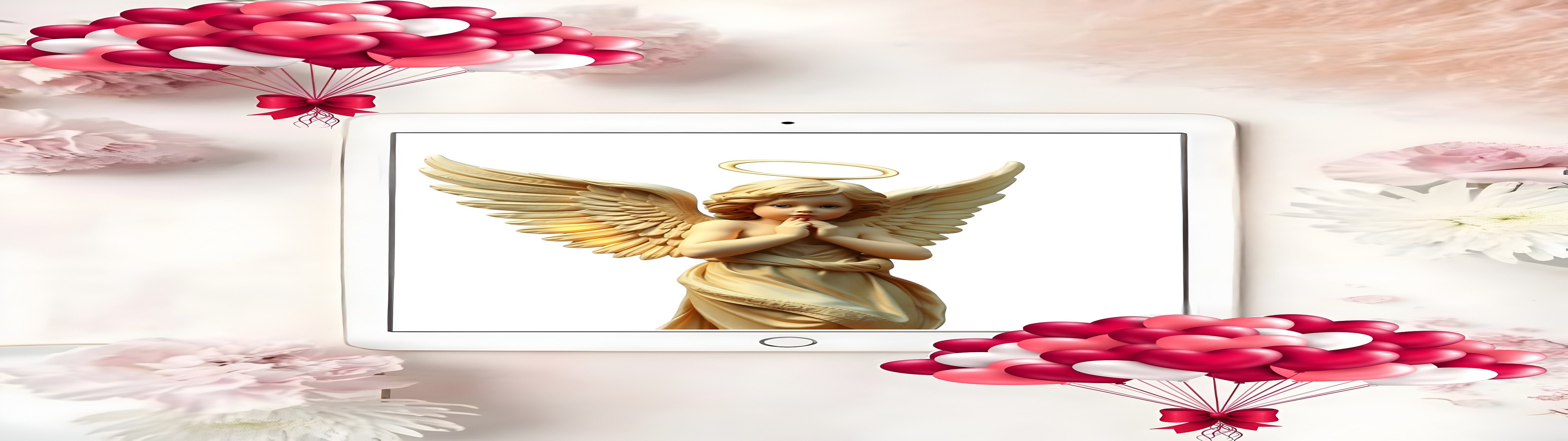 The angel’s flowing gown and curly hair evoke grace and tranquility. Surrounding the tablet are delicate white and pink flowers, along with clusters of heart-shaped balloons in red, pink, and white, tied with elegant red ribbons. The composition merges digital artistry with traditional spiritual motifs, making it ideal for users seeking a calming, romantic, and visually rich background. Its soft tones and balanced layout make it especially suitable for mobile screens, offering a serene touch to everyday device use.