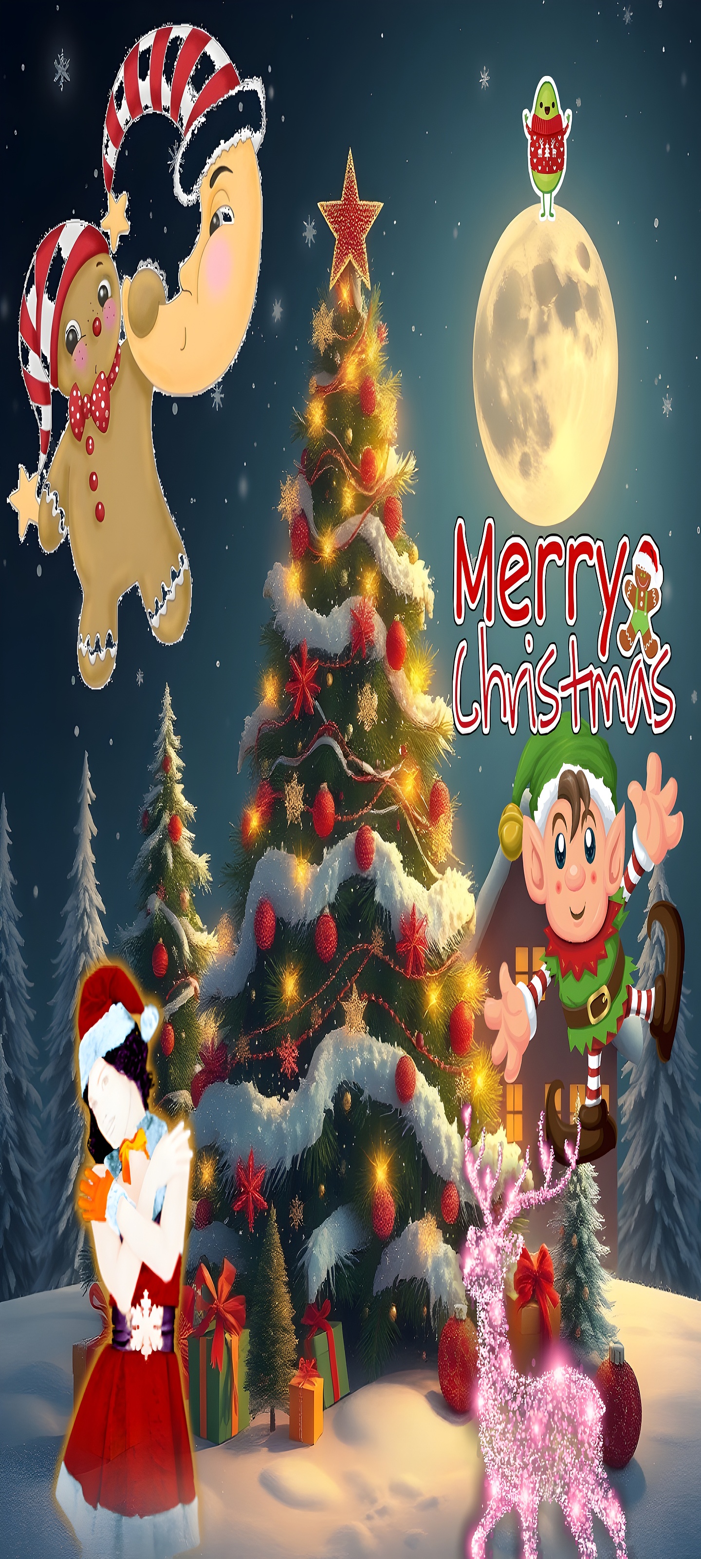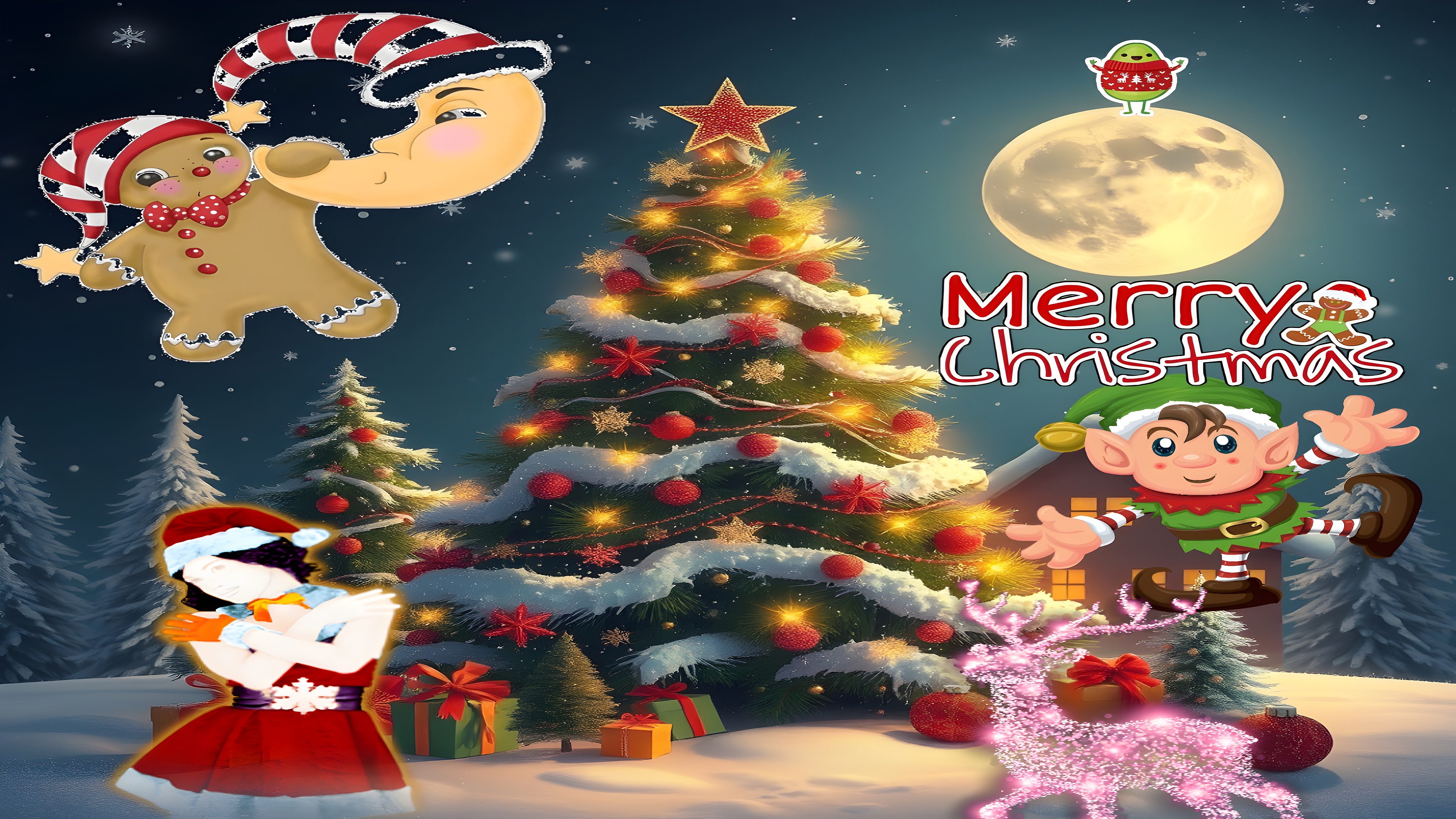 The background features a full moon with a playful green character holding an “XMAS” sign, while whimsical figures like a gingerbread man, crescent moon in a Santa hat, and a joyful elf bring a touch of fantasy. A stylish woman in a red Santa outfit adds festive flair to the bottom corner. The “Merry Christmas” text, adorned with a gingerbread accent, completes the joyful composition.