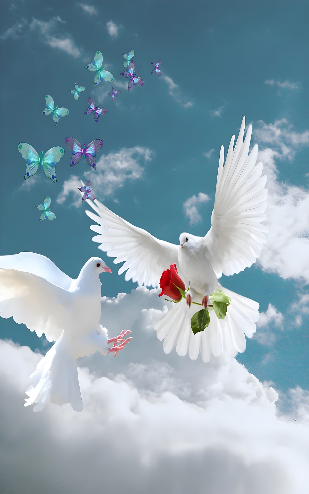 Doves Butterflies HD wallpaper captures a surreal moment of serenity and elegance. Against a vivid blue sky scattered with soft clouds, two white doves soar gracefully—one clutching a red rose, the other reaching toward a delicate pink object. Surrounding them, a flurry of butterflies in shades of turquoise, purple, and blue adds motion and magic to the composition. The image evokes themes of love, freedom, and harmony, making it ideal for those who appreciate romantic and nature-inspired visuals.