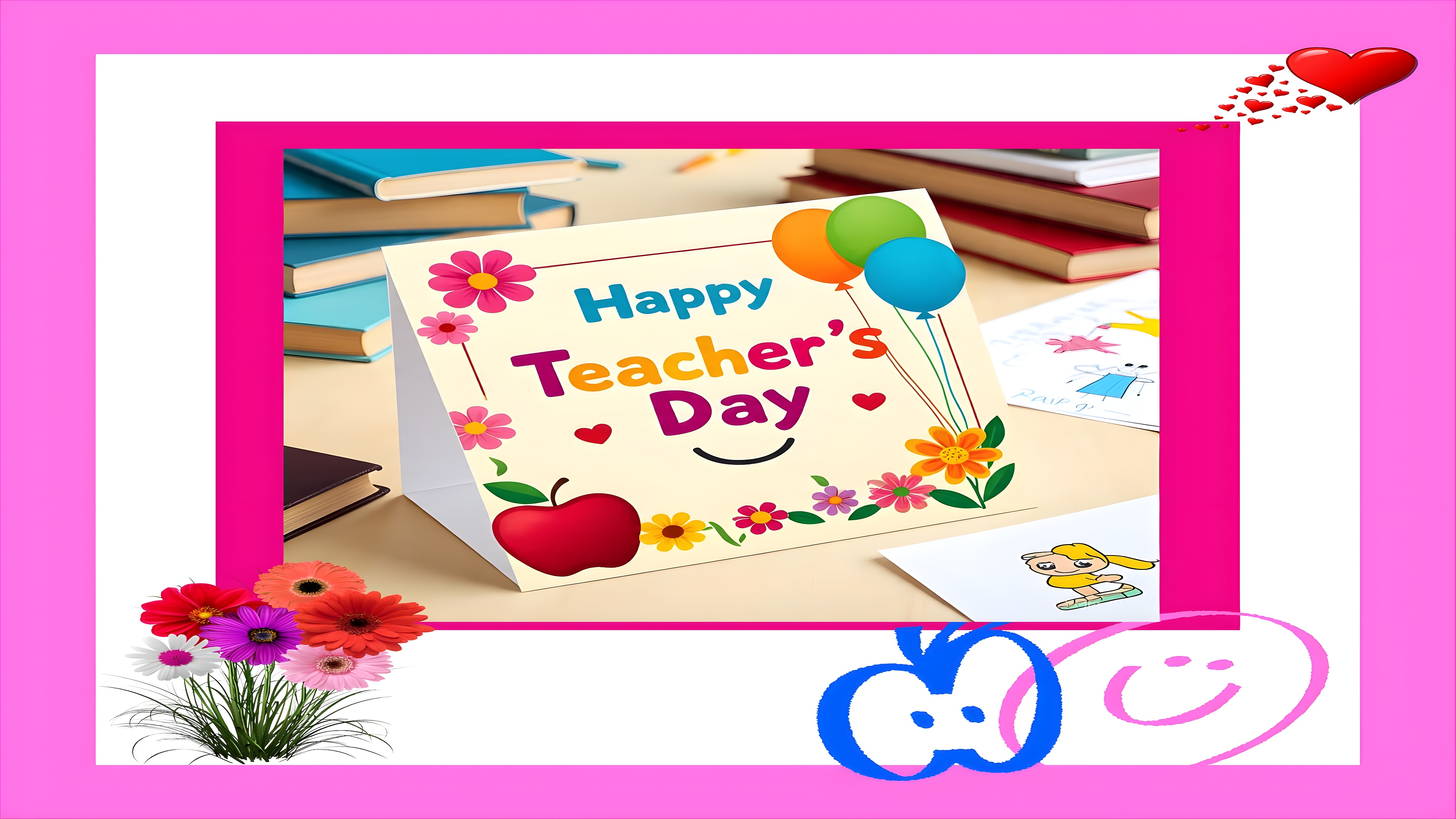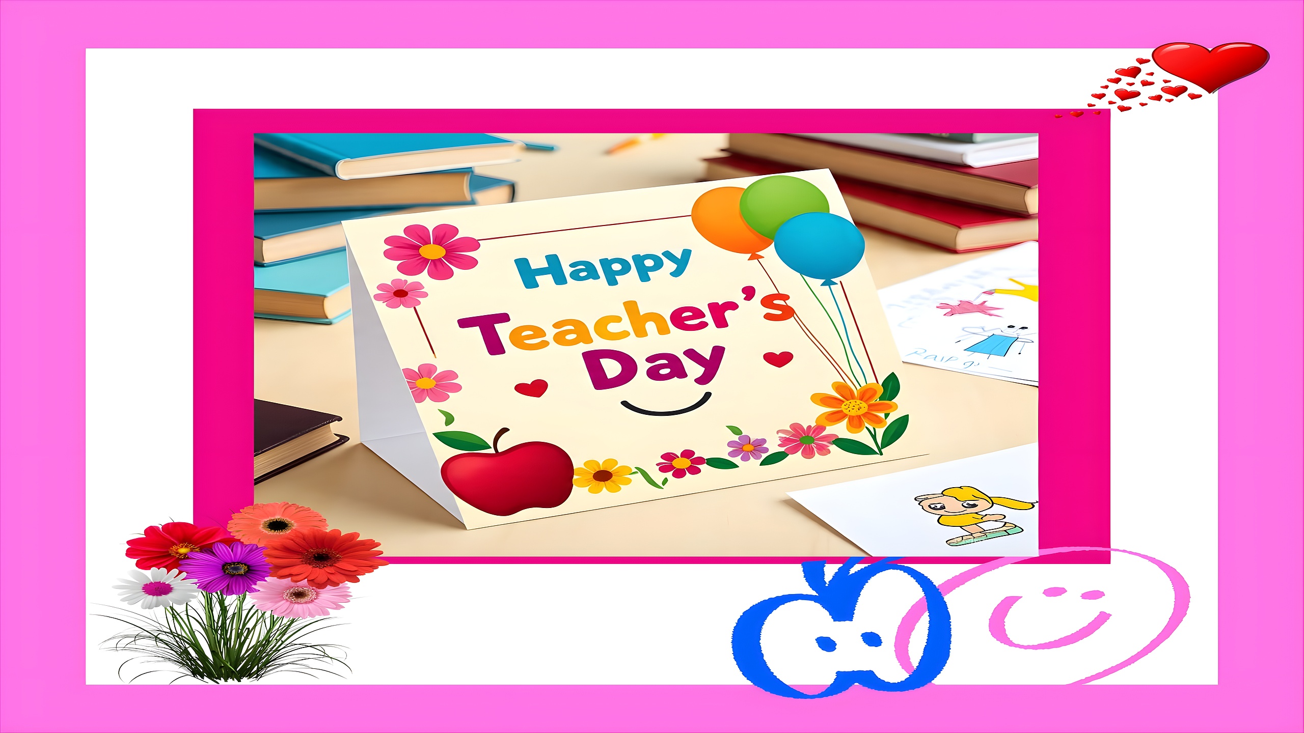 Happy Teachers Day Celebrate the spirit of education with this vibrant Happy Teacher’s Day HD wallpaper. Designed like a cheerful classroom card, it features playful elements such as balloons, smiley faces, flowers, and an apple—classic symbols of appreciation for educators. The central greeting stands out in bright, joyful colors, surrounded by books, drawings, and a heartwarming bouquet that evoke a lively school atmosphere. This wallpaper captures the warmth, gratitude, and creativity that define Teacher’s Day celebrations, making it a perfect backdrop for those who cherish learning and inspiration. Ideal for mobile screens, it brings positivity and charm to your device with every glance.