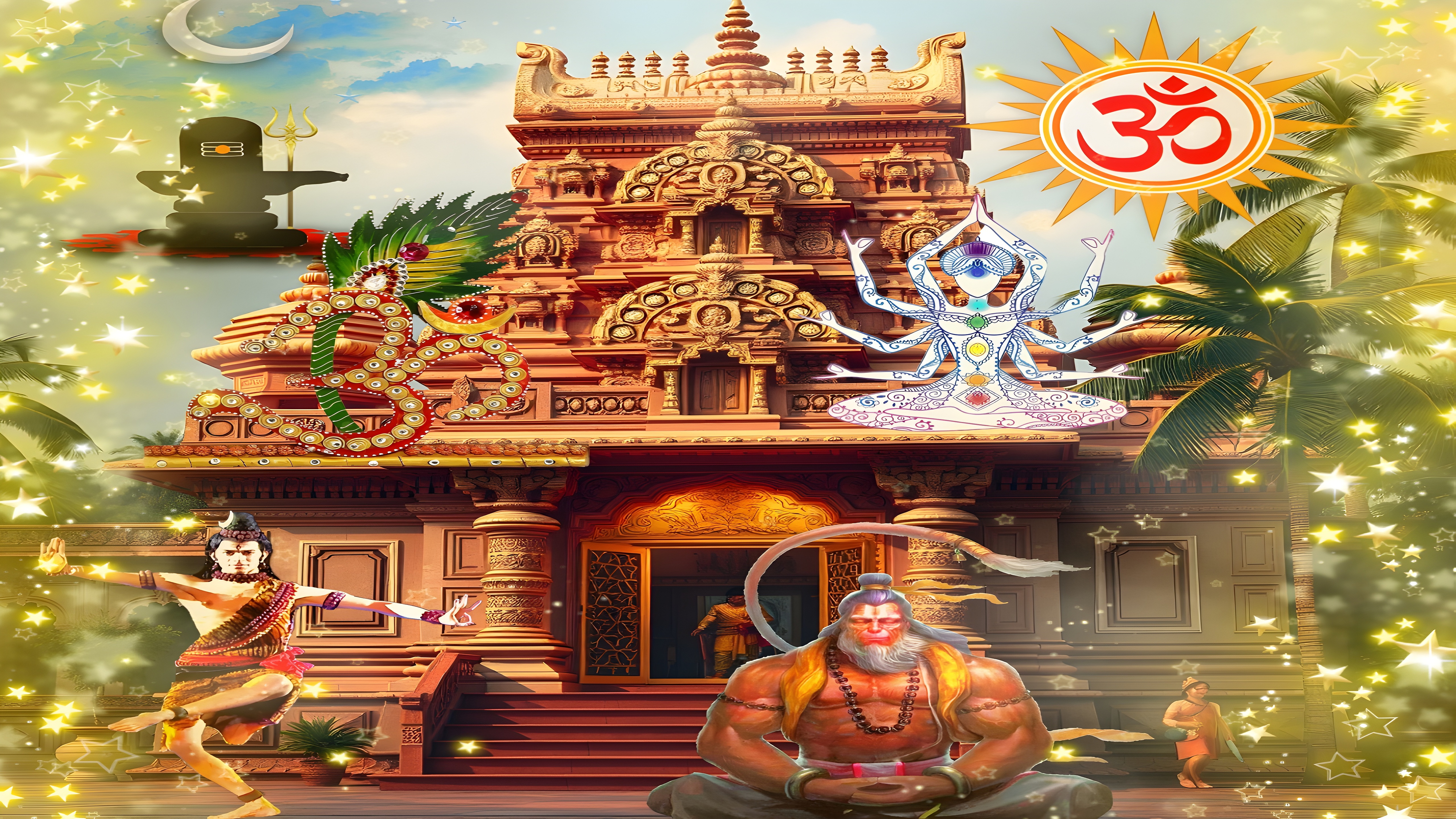 A meditative figure with aligned chakras represents spiritual awakening, while the powerful red-faced Hanuman sits in deep contemplation. The dancing Nataraja and yoga pose figures add dynamic movement and grace. Set against a glowing starry sky and tropical palms, this composition blends serenity, devotion, and cosmic energy—perfect for those seeking a spiritually rich visual experience.