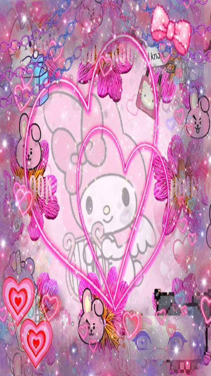 Melody Neon HD wallpaper features a dazzling collage centered around My Melody, the beloved Sanrio character. Set against a dreamy pink backdrop, the design bursts with glitter, sparkles, and layered neon heart outlines that frame My Melody in a soft, angelic pose. Surrounding her are playful cartoon bunnies in pink and purple hues, adorned with floral accents and shimmering bows. Decorative chains, heart-shaped ornaments, and repeated “LOOK” text elements add a bold, pop-art flair to the composition.