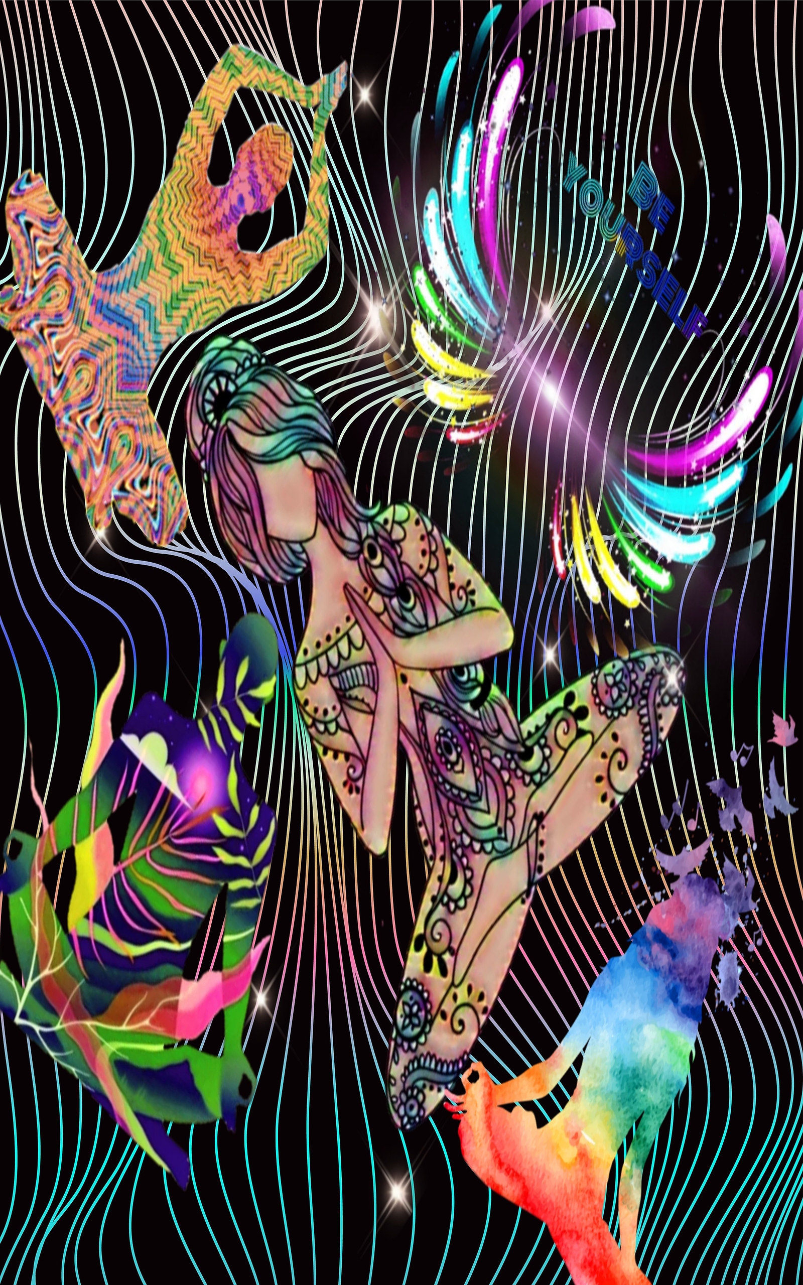 The background pulses with multicolored waves and neon arcs, creating a sense of motion and depth against the black canvas. Sparkles and rainbow textures enhance the surreal atmosphere, while the faint word “YOURSELF” hints at the theme of inner discovery.