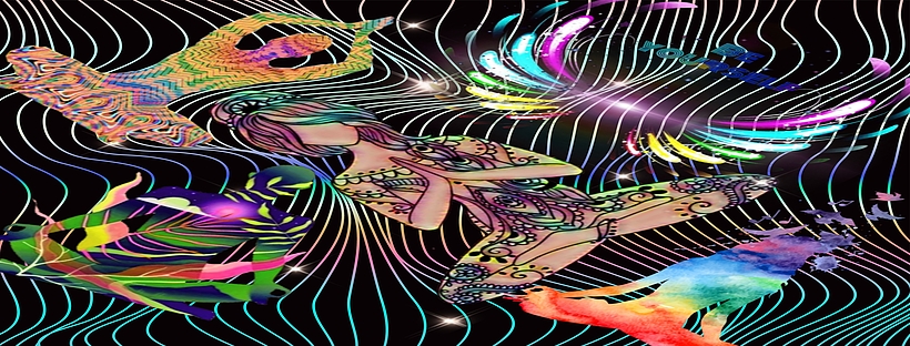 Psychedelic meditation vibrant HD wallpaper captures a psychedelic fusion of meditation, cosmic energy, and abstract human forms. At its center, a meditative figure adorned with intricate tribal patterns radiates calm and introspection. Surrounding it are dynamic silhouettes—one dissolving into birds, another forming a mudra—each symbolizing transformation and spiritual awakening.