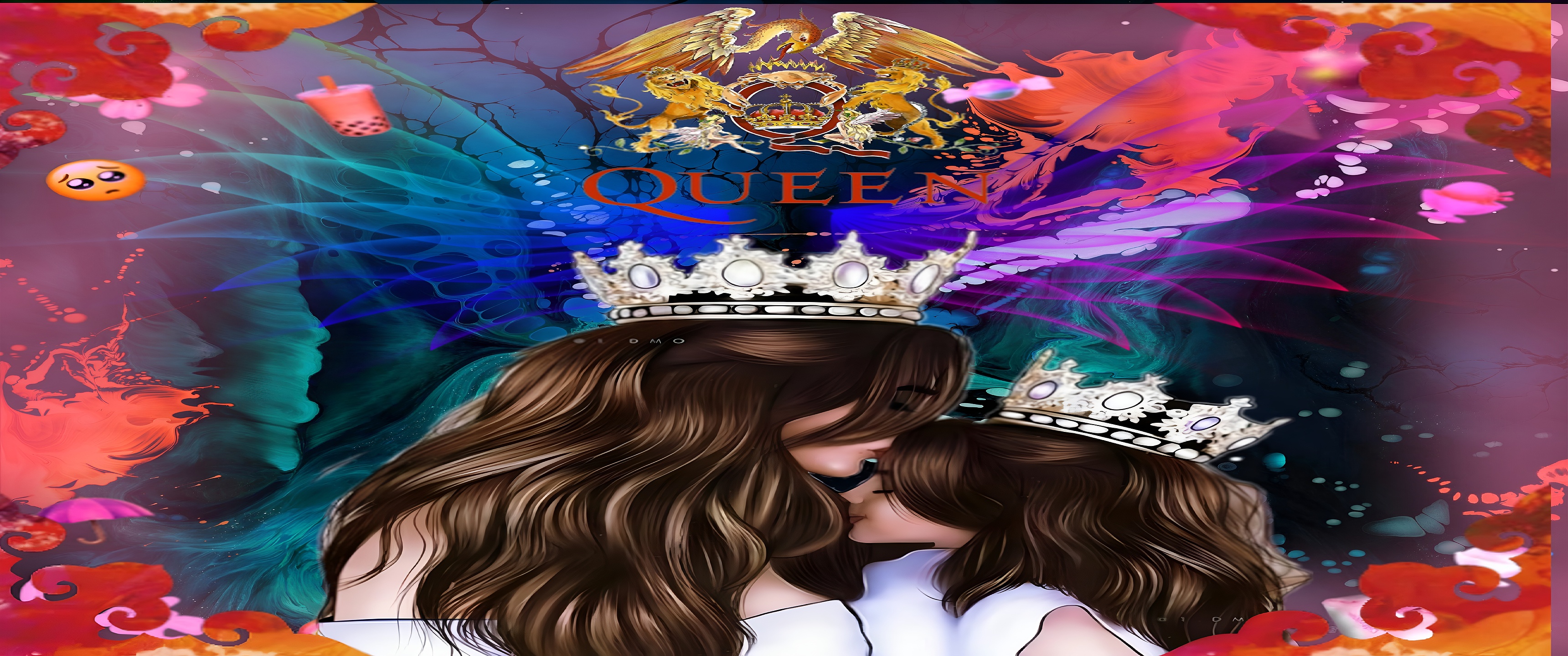 Queenly Bond captures a tender moment between two crowned figures, likely a mother and child, set against a radiant, abstract backdrop. Their white garments and ornate headpieces evoke royalty, while the gentle forehead touch conveys deep emotional connection. Above them, a golden emblem with lions and a crown reinforces the regal theme, with the bold word “QUEEN” anchoring the composition.