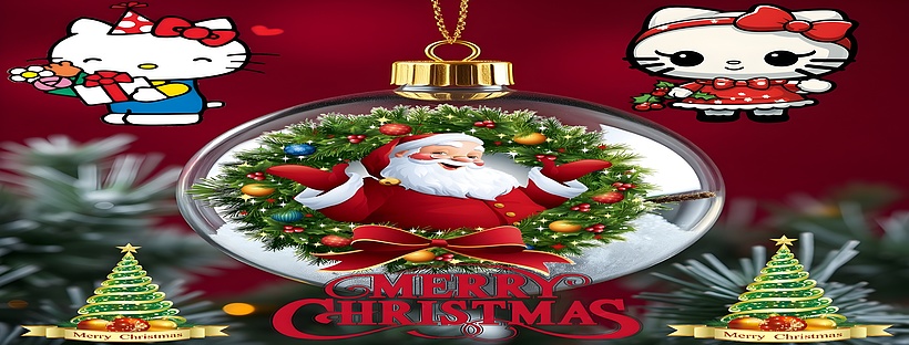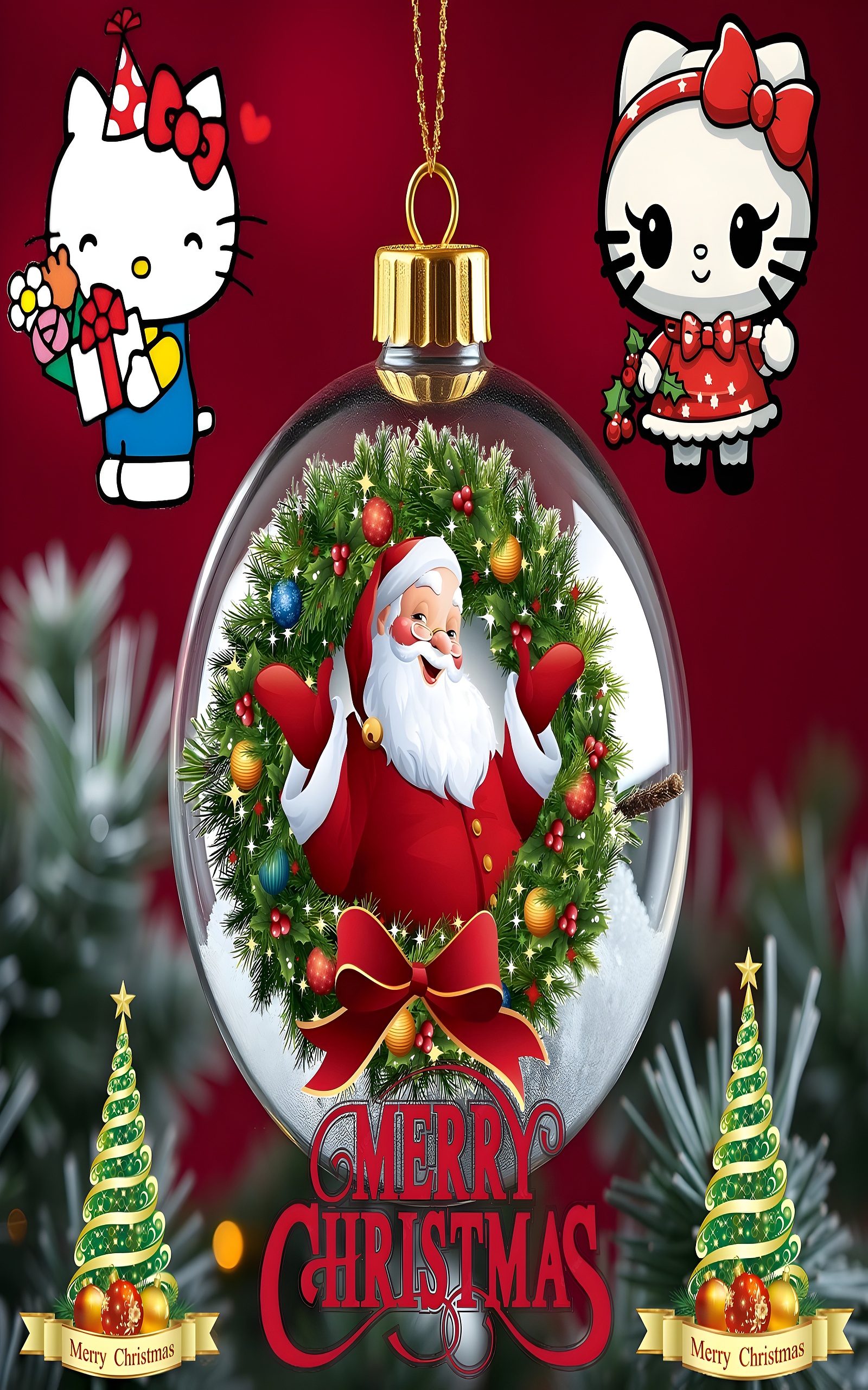Celebrate the Santa Ornament Hello kitty magic of Christmas with this vibrant HD wallpaper featuring a transparent ornament showcasing Santa Claus encircled by a lush green wreath adorned with red ribbons, baubles, and holly. The bold “MERRY CHRISTMAS” text beneath Santa adds a joyful touch, making it perfect for seasonal cheer.