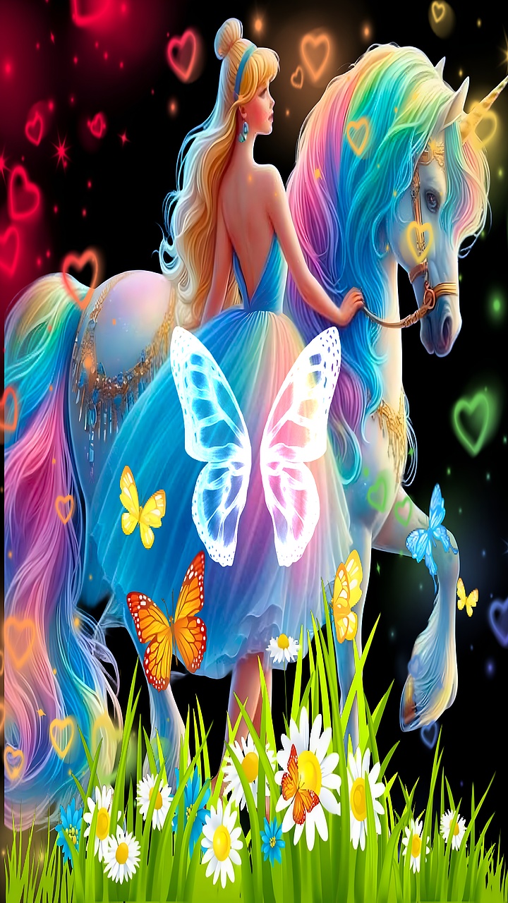 You can download this wallpaper for free using the button below. If you enjoy this style, explore more backgrounds in Categories: Fantasy or browse related Tags: Enchanted Girl, Fantasy Unicorn, Magical Butterfly, Rainbow Mane, Whimsical to discover similar HD wallpapers.