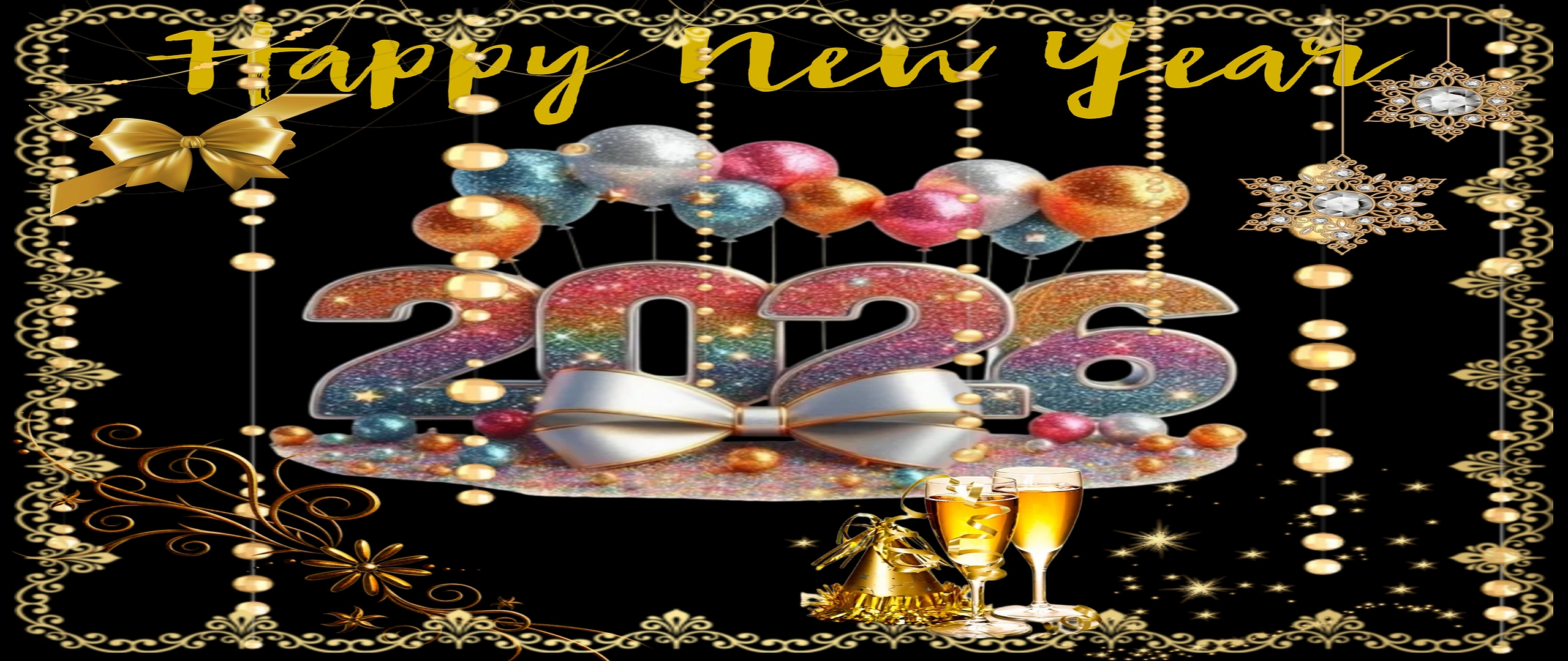 Celebrate the arrival of the new year with this stunning 2026 New Year Celebration HD Wallpaper, designed to bring a luxurious and festive atmosphere to your desktop or mobile device. This high-resolution wallpaper captures the essence of New Year's Eve with its elegant combination of golden hues, sparkling lights, and celebratory balloons. The dominant black background creates a perfect contrast that enhances the shimmering gold and silver elements, making the entire composition pop with a sense of glamour and excitement.