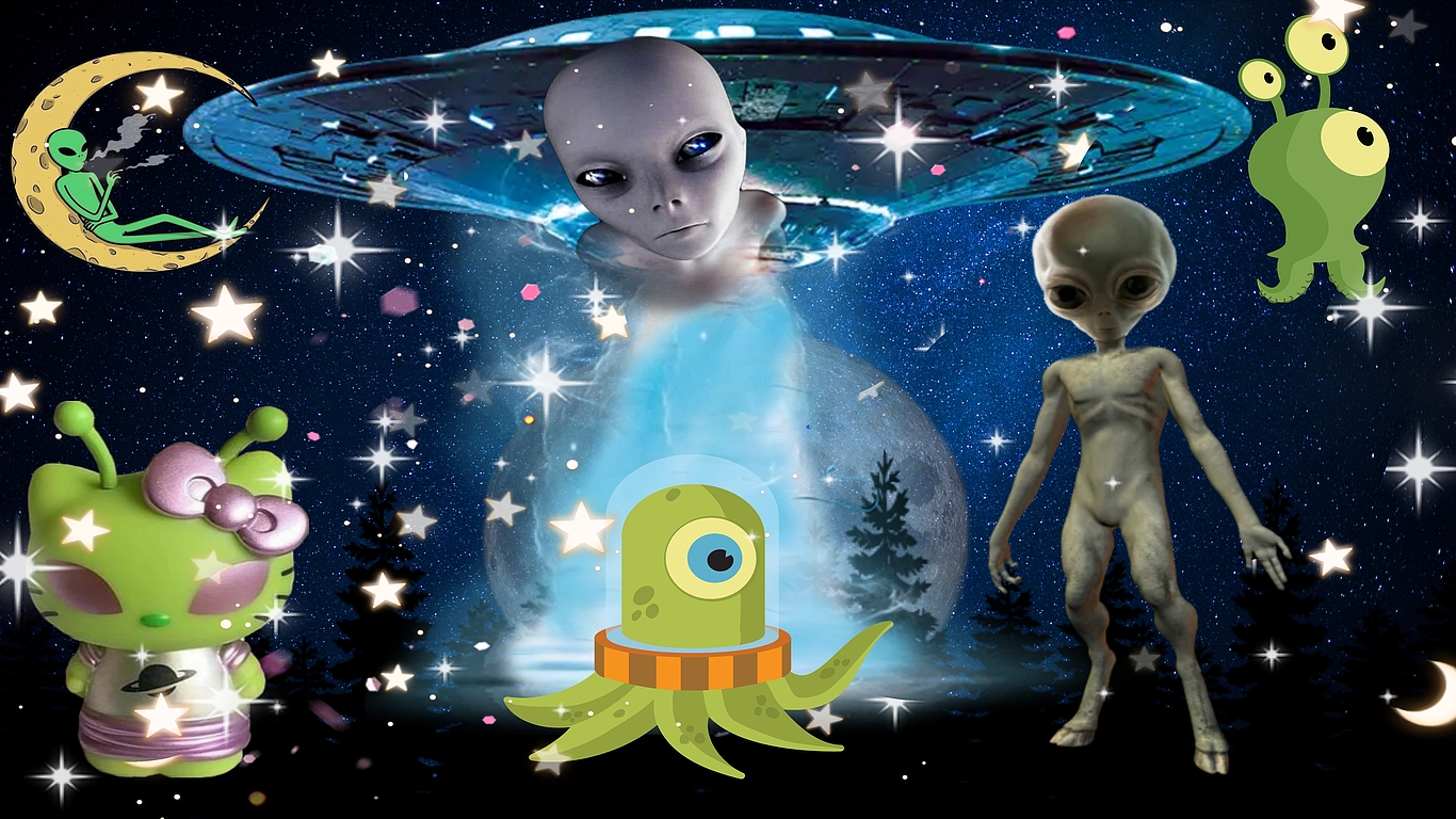 Each character adds charm and personality to the cosmic setting. The starry night sky and silhouetted trees in the background create a magical, otherworldly atmosphere that blends fantasy with sci-fi. Perfect for fans of alien art, whimsical space themes, and character-rich digital scenes, this wallpaper brings a vibrant and surreal touch to your device.