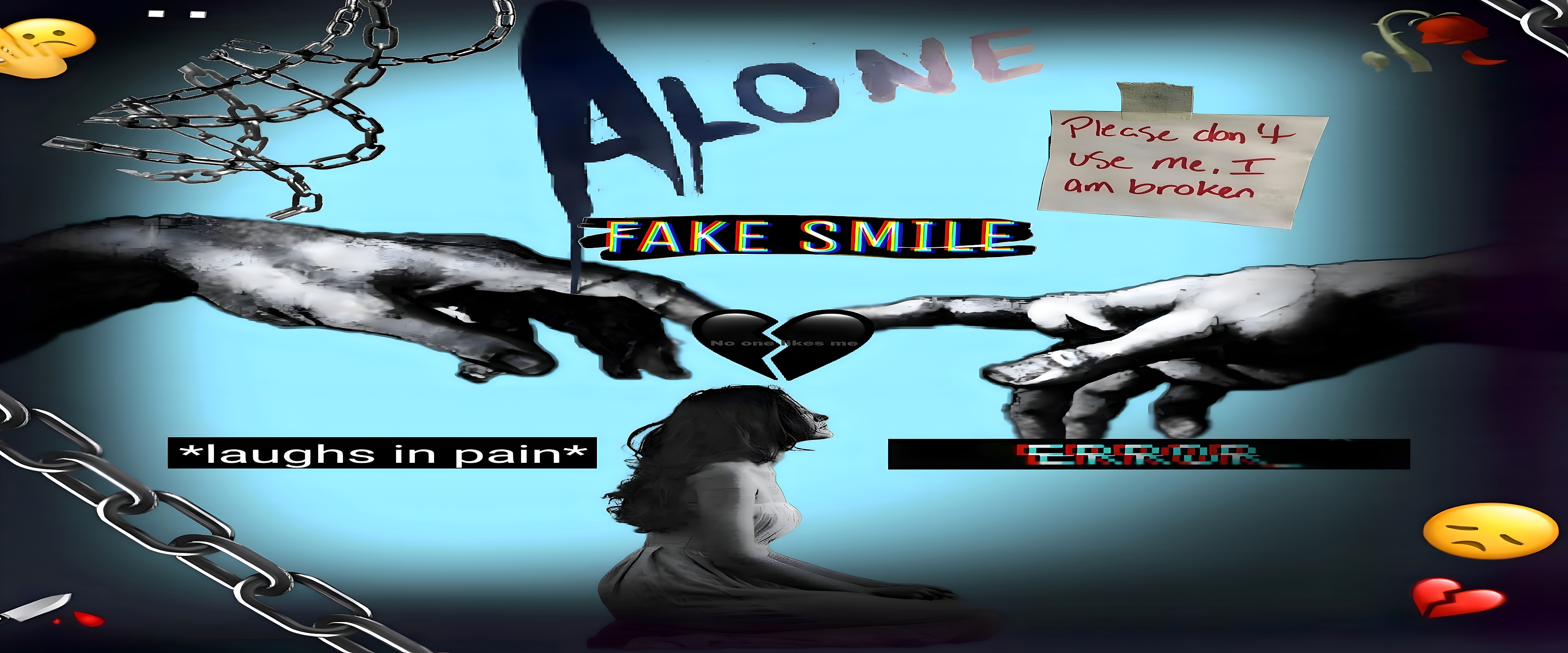 This wallpaper’s artistic elements include the use of monochrome textures on the hands and figure, which provide a stark contrast to the smooth, calming blue backdrop. The chains symbolize restriction or emotional bondage, while the broken heart and glitch text "ERROR" reinforce themes of emotional breakdown and disconnection. The handwritten note taped above reads, "Please don't use me, I am broken," adding a raw, personal touch to the digital art. The inclusion of emojis such as the sad face and broken heart further modernizes the expression of pain and loneliness. This blend of classical and digital art styles creates a unique visual narrative that resonates deeply with viewers seeking emotive and meaningful desktop backgrounds or mobile wallpapers.