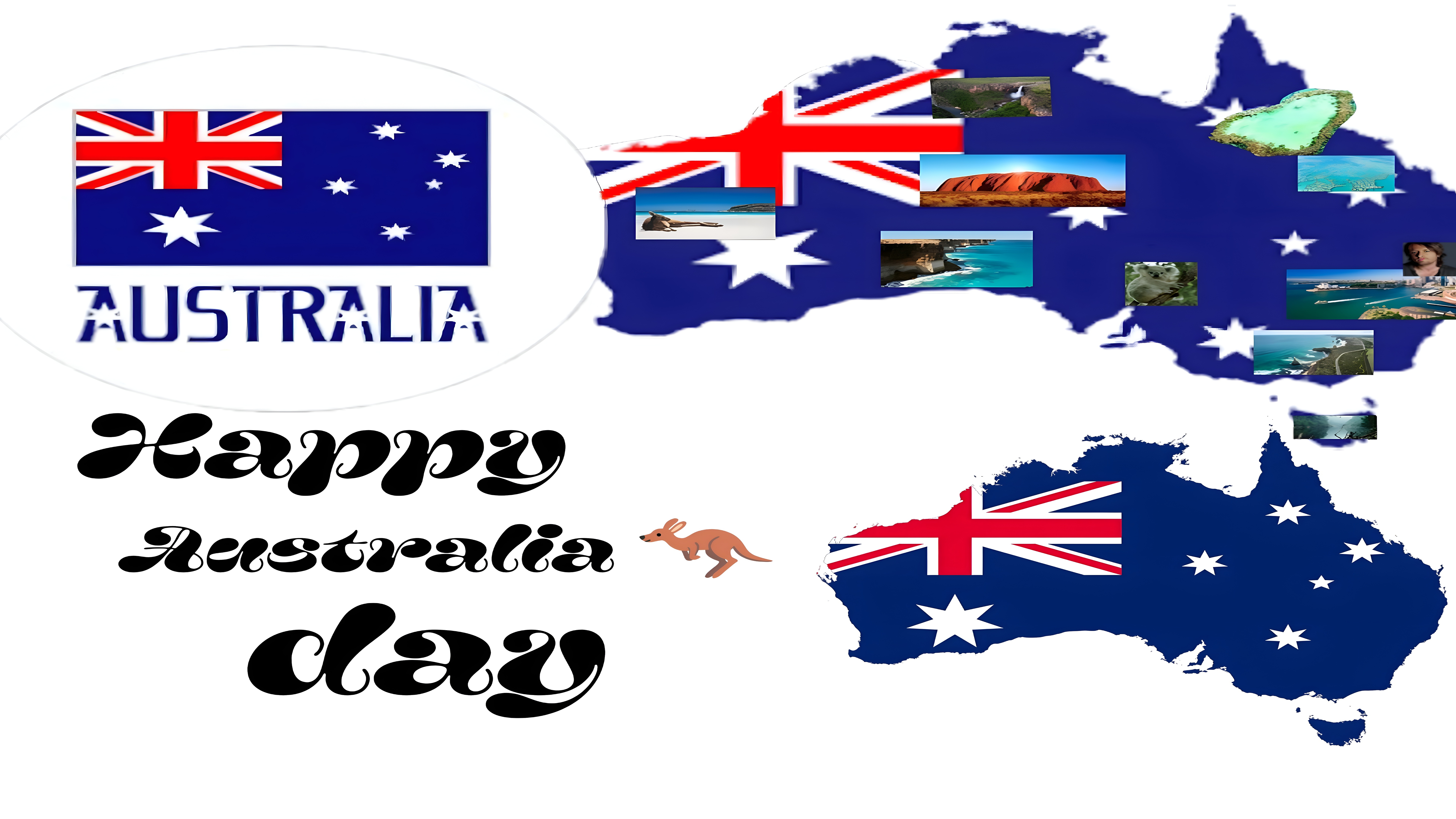 This Australia Day Celebration Map wallpaper beautifully captures the essence of Australia's most famous landmarks and natural wonders. From the majestic red rock of Uluru to the crystal-clear waters of the Great Barrier Reef, each image is carefully placed to correspond with its geographic location on the map. The wallpaper also features coastal cliffs, serene beaches, and lush waterfalls, showcasing the country's diverse ecosystems. The presence of native wildlife, such as the koala and a kangaroo emoji, adds a charming cultural touch that resonates with Australian identity. This wallpaper is an excellent choice for those seeking high-definition backgrounds that celebrate Australia's unique environment and heritage, perfect for use on devices with wide aspect ratios like 16:9 or 21:9.