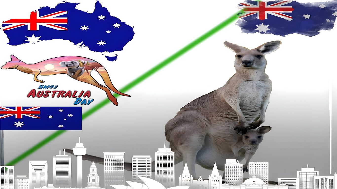 This stunning Australia Day Kangaroo Celebration wallpaper captures the essence of Australian pride and wildlife in a beautifully composed digital artwork. The main subject is a lifelike kangaroo with its joey peeking out from the pouch, symbolizing nurturing and the unique fauna of Australia. The kangaroo stands prominently against a subtle gradient background, creating a calm and focused atmosphere. Surrounding the kangaroo are artistic elements including multiple renditions of the Australian flag, a stylized map of Australia filled with the flag’s colors, and a kangaroo silhouette featuring a koala and a sunset scene inside it, blending wildlife and national symbols seamlessly.