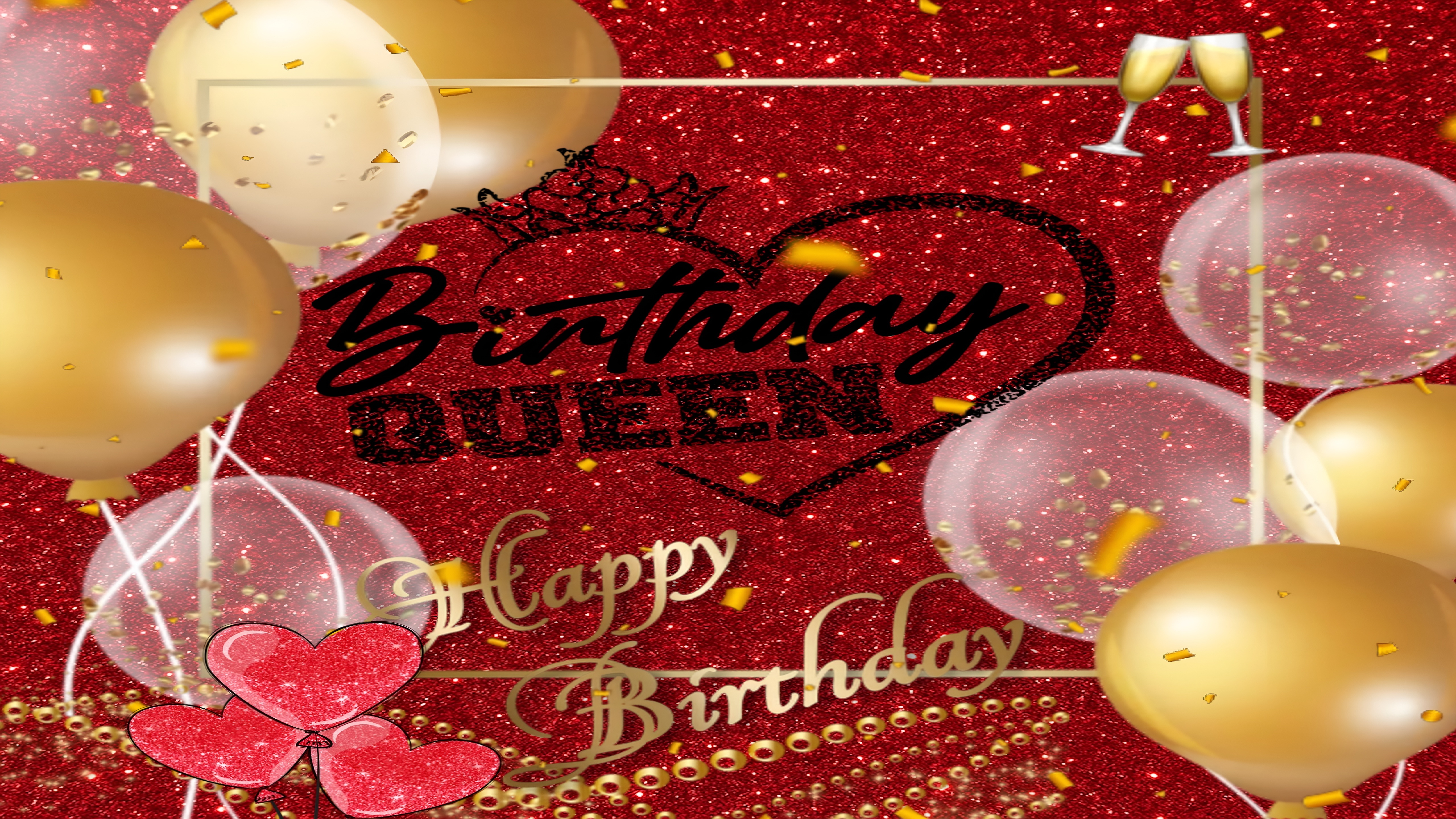 The Birthday Queen Celebration Wallpaper combines artistic elegance with festive charm through its use of glitter textures, metallic gold highlights, and transparent white balloons that float softly against the vivid red backdrop. The black scripted "Birthday Queen" text crowned with a tiara adds a regal touch, while the golden confetti scattered throughout the image enhances the celebratory mood. The inclusion of delicate champagne glasses in the upper corner subtly hints at a toast-worthy occasion, enriching the overall atmosphere.
