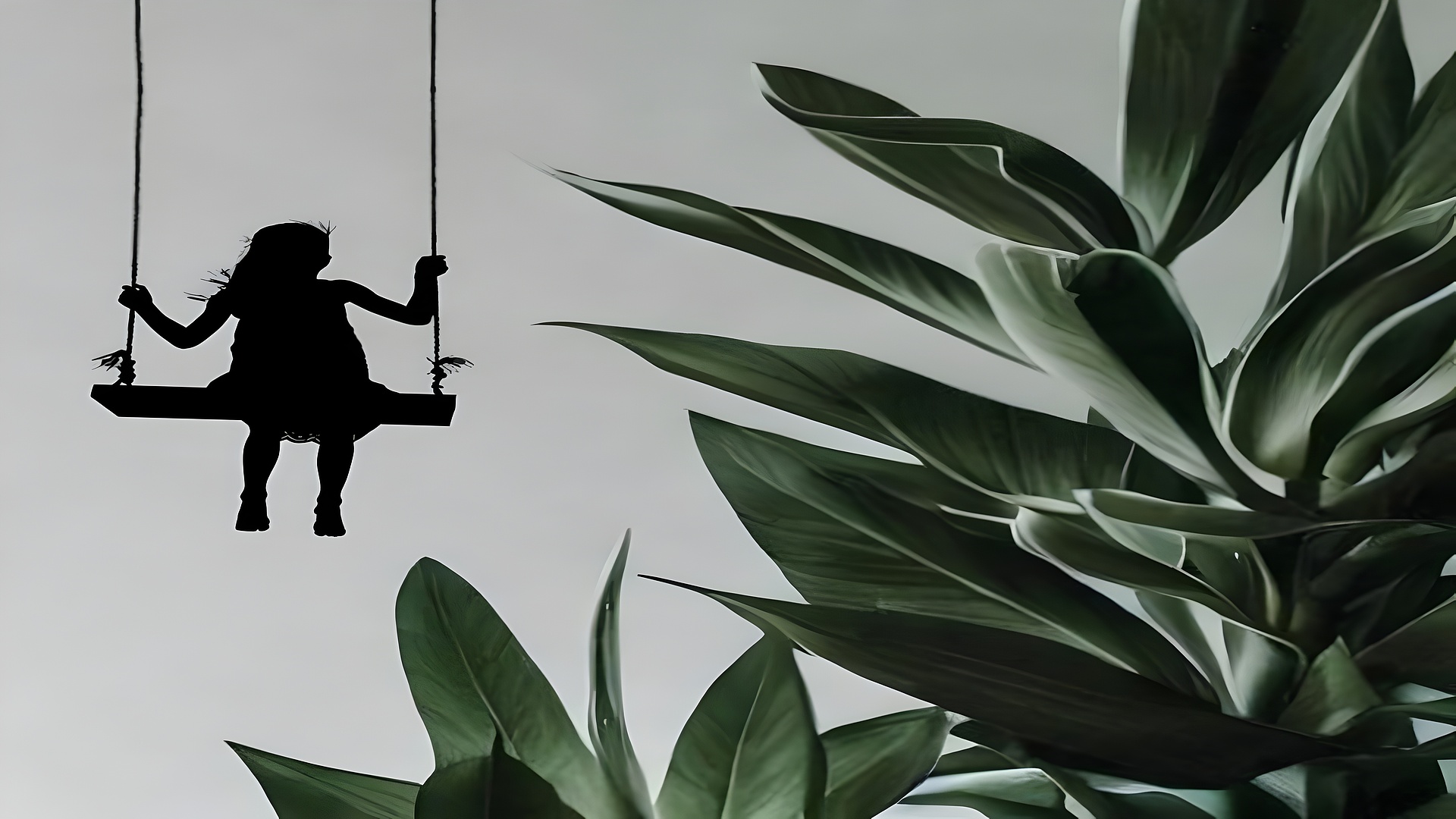 Child swing tropical leaves this HD wallpaper captures a poetic silhouette of a child gently swaying on a rope swing, framed by lush green tropical leaves. The muted gray background enhances the contrast, making the child’s outline and the vibrant foliage stand out with striking clarity.