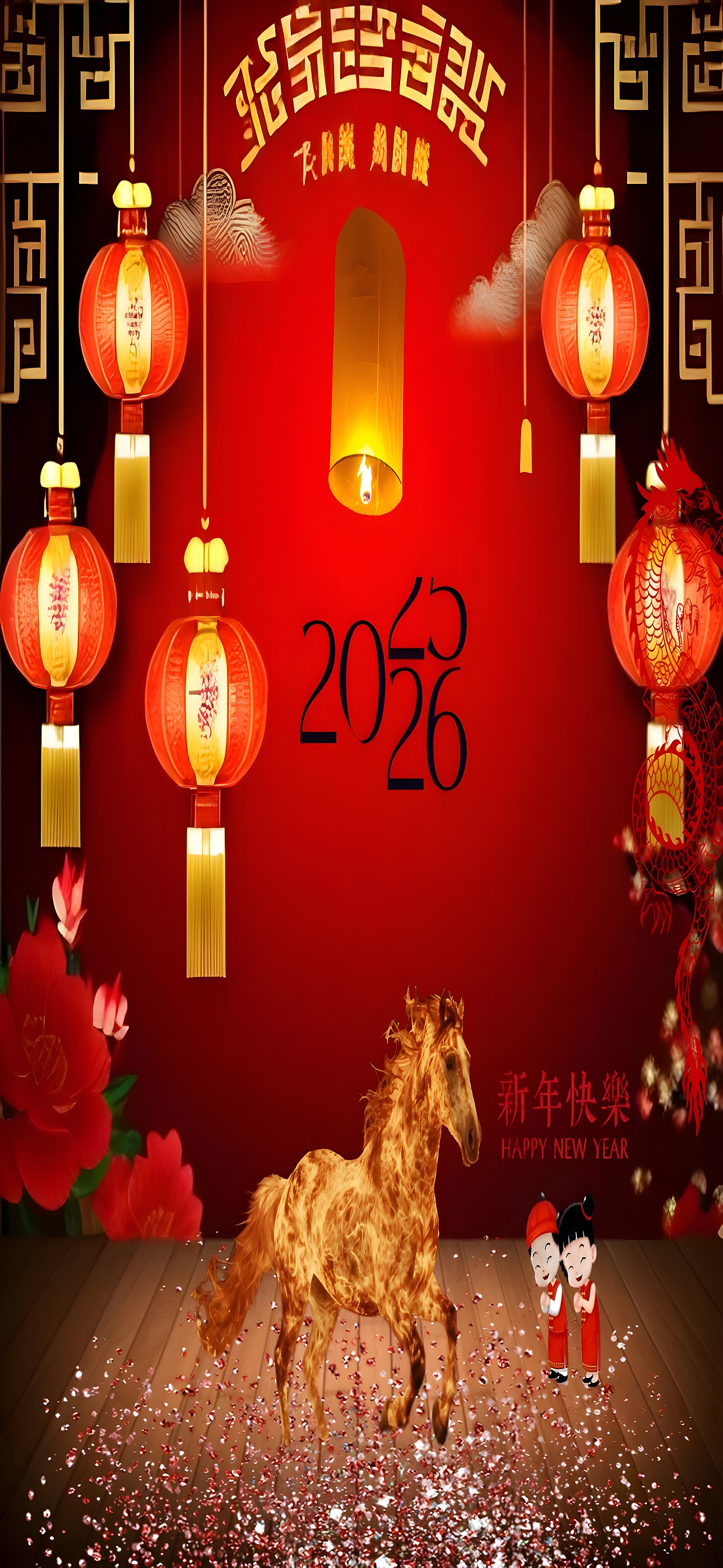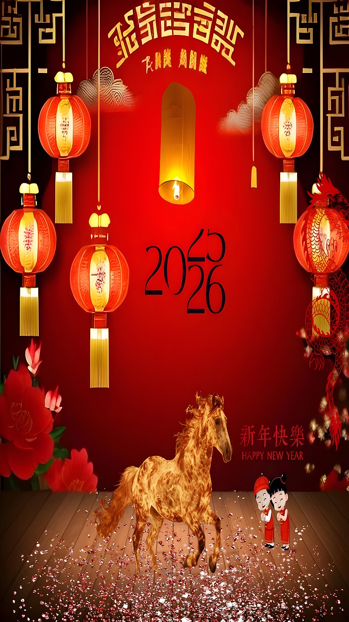 This Chinese New Year Horse Celebration wallpaper beautifully integrates iconic symbols such as red lanterns, dragons, and floral motifs, which are deeply rooted in Asian culture. The red color symbolizes good fortune and joy, while the golden yellow accents represent wealth and prosperity. The fiery horse is a powerful emblem of energy and progress, fitting for the transition between 2025 and 2026. This high-resolution wallpaper is ideal for those seeking festive desktop backgrounds or mobile wallpapers that celebrate the Lunar New Year with authenticity and artistic flair. The inclusion of traditional attire and lanterns makes it a perfect choice for spring festival enthusiasts looking to enhance their devices with cultural wall art.
