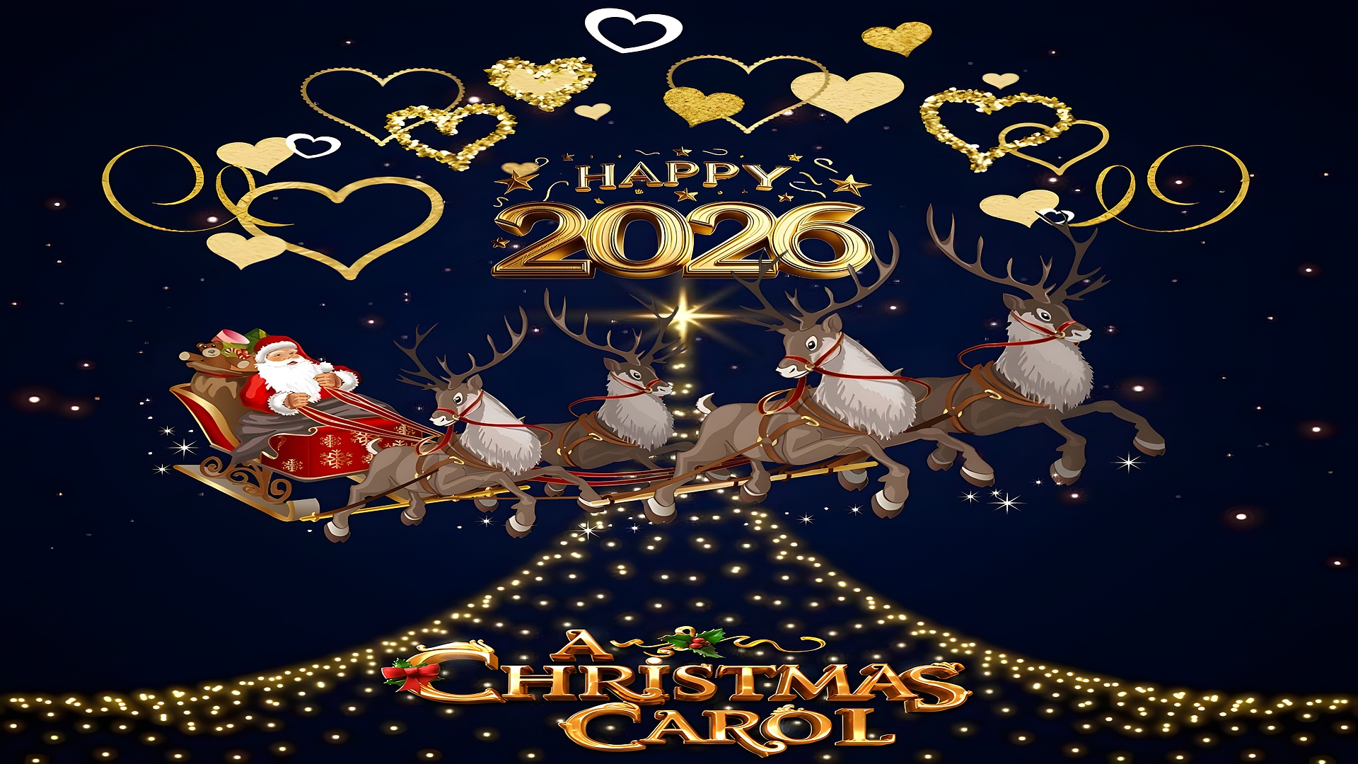 Christmas carol happy 2026 this festive HD wallpaper captures the enchanting spirit of the holiday season and the excitement of welcoming 2026. Featuring Santa Claus in a beautifully ornate red sleigh pulled by four reindeer, the image soars through a starry night sky filled with golden sparkles and shimmering hearts.