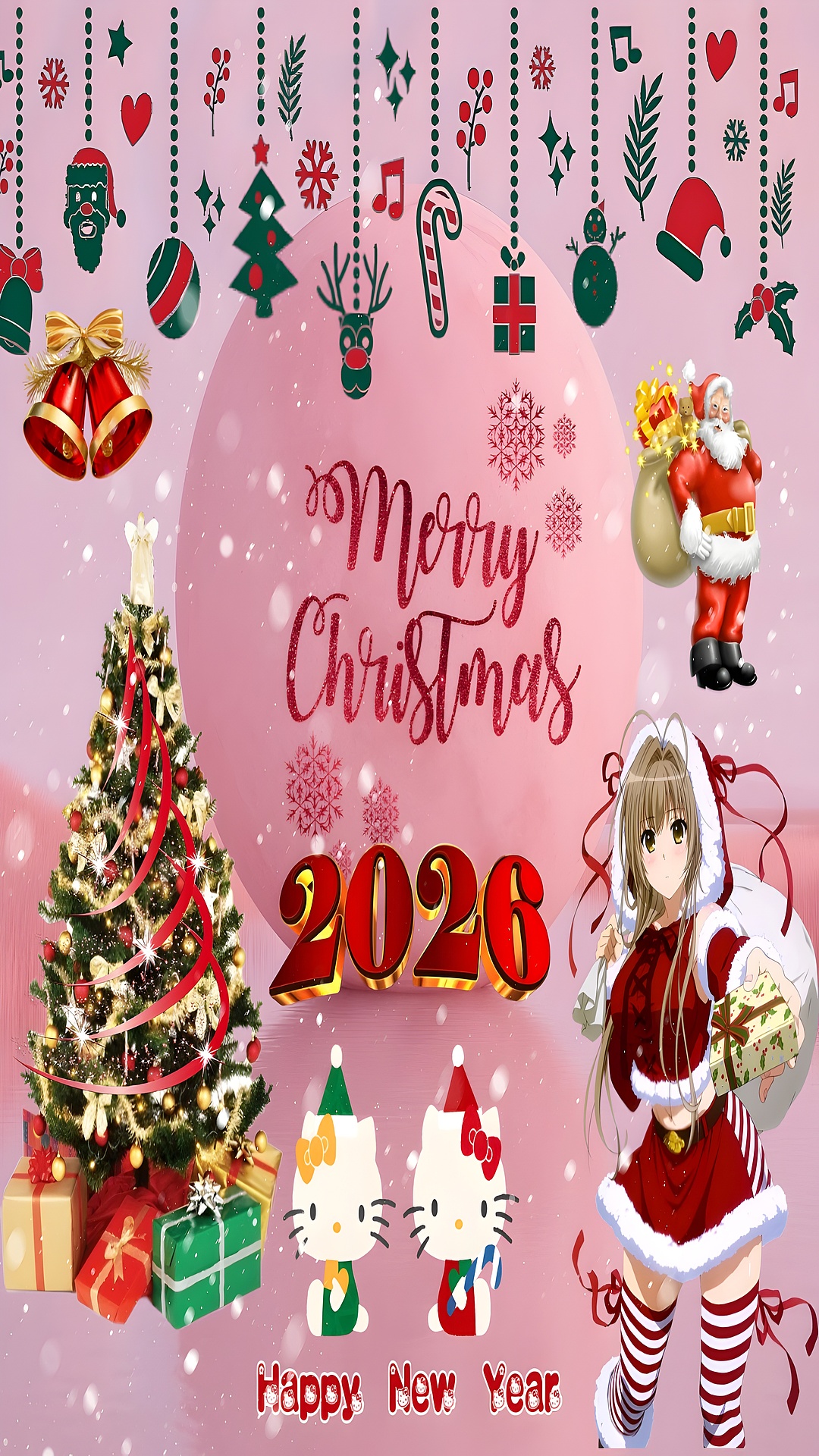 Christmas New year 2026 festive this HD wallpaper captures the joyful spirit of Christmas and New Year 2026 in a vibrant, playful design. Set against a soft pink snowy background, it features hanging ornaments like Santa faces, candy canes, bells, and snowflakes. The center showcases a bold “Merry Christmas” greeting surrounded by festive elements, while the colorful “2026” adds a fresh New Year vibe.