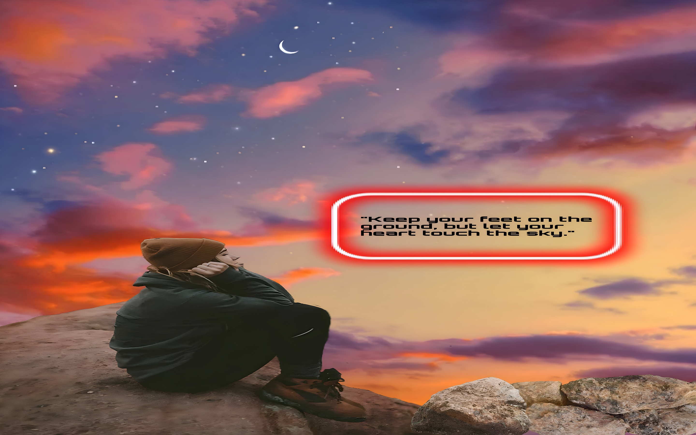 The warm orange and soft pink hues of the sunset clouds blend seamlessly with deep purple accents, creating a soothing palette that enhances the wallpaper's contemplative mood. The muted brown tones of the rocky foreground and the figure's clothing ground the image, reinforcing the theme of staying connected to the earth while reaching for the sky. The crescent moon and twinkling stars add a celestial element that inspires wonder and reflection. This wallpaper is ideal for those looking for high-definition backgrounds that combine natural beauty with inspirational messages, making it a standout choice for anyone seeking a peaceful and motivational desktop or mobile wallpaper.