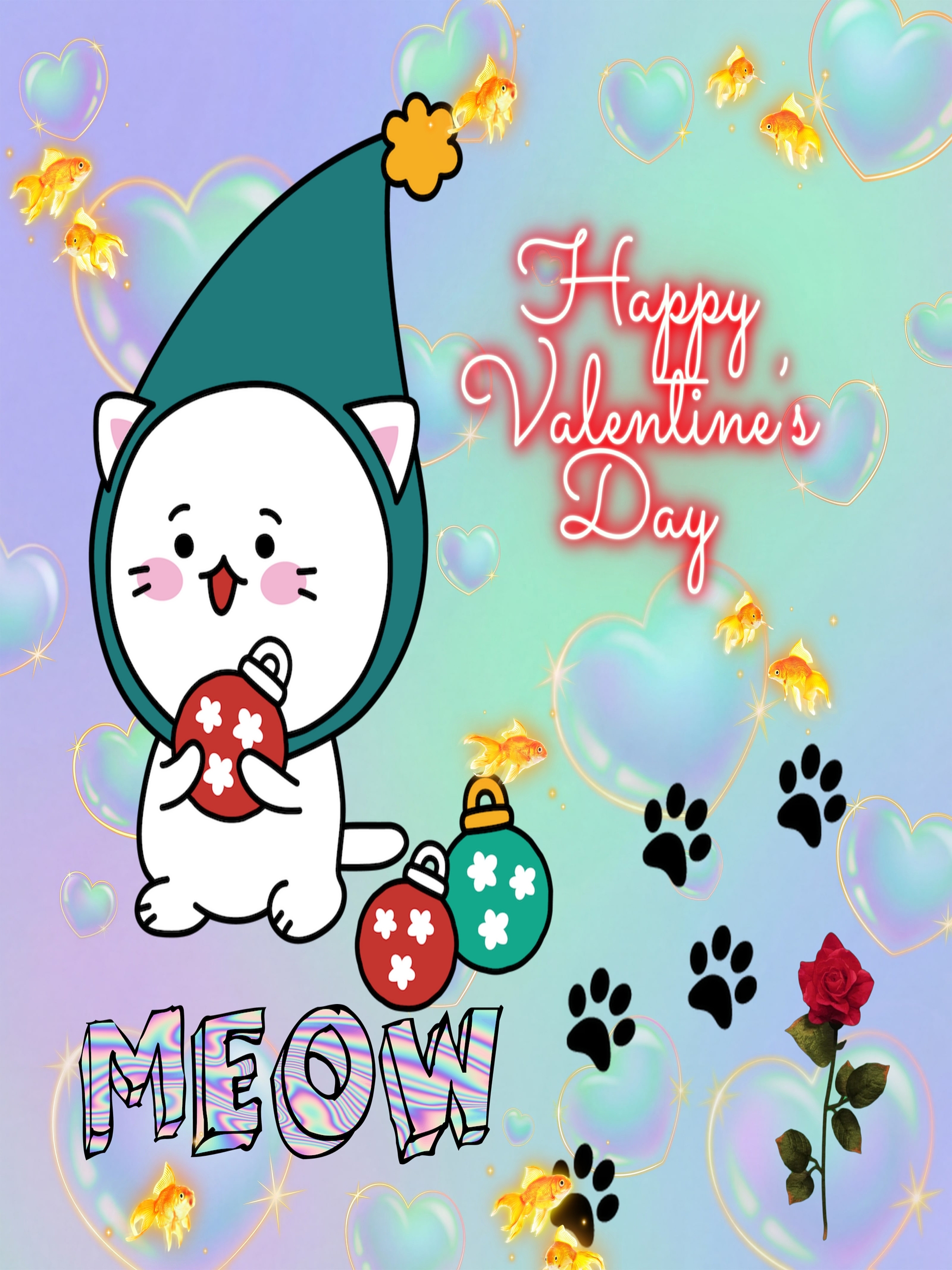 The wallpaper also includes floating golden yellow goldfish and black paw prints scattered across the scene, adding a fun and quirky touch to this Valentine-themed design. A single red rose with green leaves stands out on the right side, symbolizing love and passion. The neon-style glowing text "Happy Valentine's Day" in bright red script adds a festive and heartfelt message, perfectly complementing the overall theme. This high-resolution wallpaper combines cute cartoon elements with soft pastel colors and romantic symbols, making it an ideal choice for anyone looking to brighten their desktop or mobile screen with love and joy.