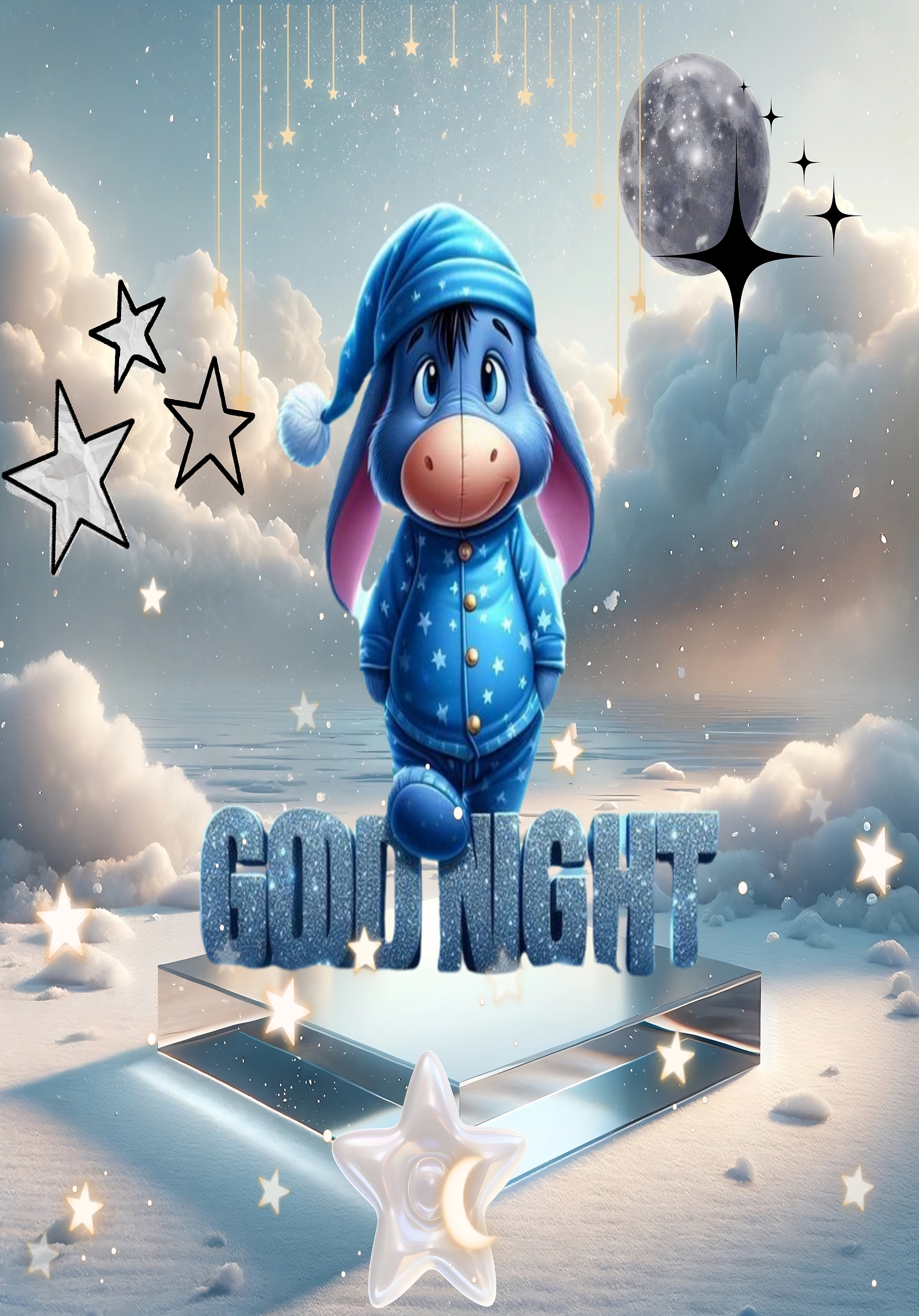 This wallpaper showcases a blend of soft textures and glowing light effects that enhance its dreamy quality. The lighting is subtle yet magical, with stars softly illuminating the scene and casting gentle reflections on the glass platform beneath Eeyore. The detailed textures of the clouds and the plush fabric of Eeyore's pajamas add depth and warmth to the image. The floating stars and the crescent moon embedded in the star shape at the bottom foreground contribute to the enchanting night motif. This high-resolution wallpaper captures the essence of a peaceful bedtime story, making it a perfect desktop background or mobile wallpaper for those who appreciate cute, animated characters and nighttime serenity.
