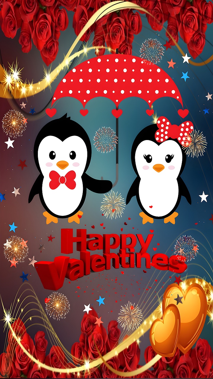 Its playful yet elegant design makes it a great choice for seasonal desktop backgrounds, romantic mobile wallpapers, or even printed wall art for Valentine’s Day celebrations. The combination of festive fireworks, heart motifs, and charming penguin characters ensures this wallpaper stands out as a joyful and loving visual statement. The rich reds and golden accents enhance the romantic theme, while the soft black and white of the penguins provide a balanced contrast that is easy on the eyes.