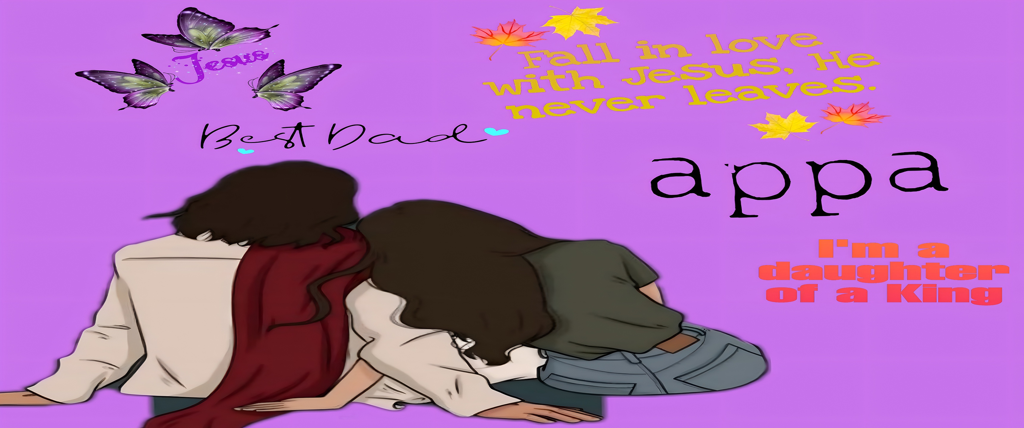 The wallpaper features meaningful text elements that enhance its spiritual and familial themes. Phrases like "Fall in love with Jesus, He never leaves," "Best Dad," "appa," and "I'm a daughter of a King" are artfully arranged with decorative autumn leaves and delicate purple butterflies, symbolizing transformation and faith. This combination of warm colors like deep red and autumn yellow with the soft purple backdrop creates a harmonious palette that evokes comfort, devotion, and hope.