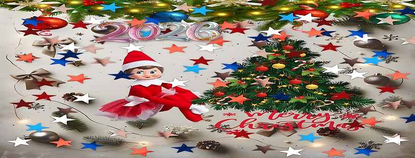 This vibrant Festive 2026 Christmas Elf Wallpaper captures the joyful spirit of the holiday season with a charming elf figure dressed in classic red and white attire, sitting playfully amidst a dazzling array of colorful stars and Christmas decorations. The wallpaper prominently features the year "2026" in shiny balloon-style numbers, adding a fresh and celebratory touch to this seasonal design. A beautifully decorated Christmas tree adorned with candy canes, baubles, and golden garlands stands beside the elf, enhancing the festive ambiance. The overall composition is lively and inviting, perfect for bringing holiday cheer to any desktop or mobile screen.