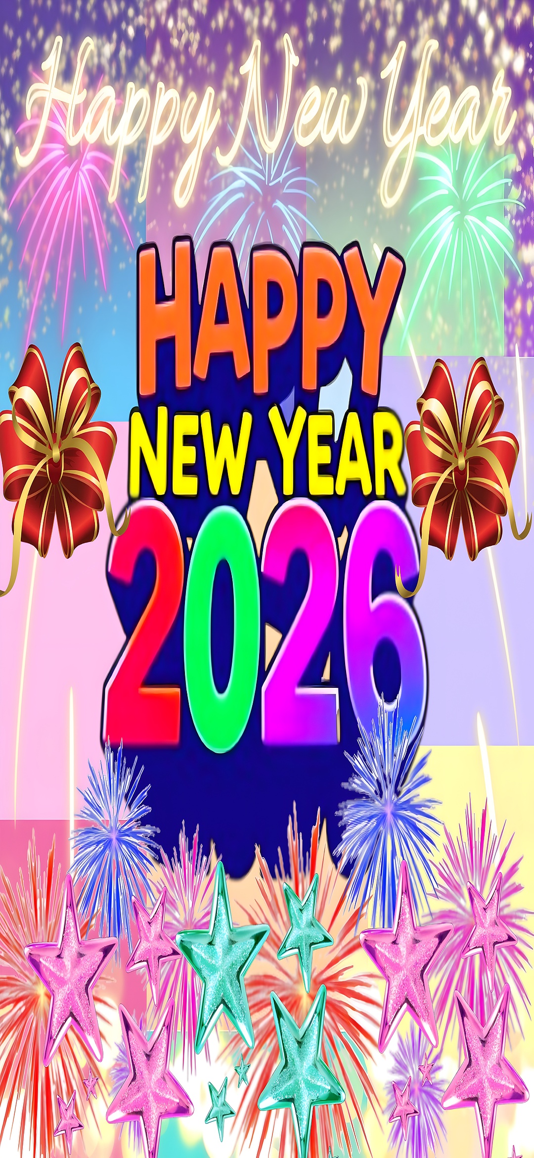Festive fireworks Celebrate the arrival of 2026 with this dazzling New Year wallpaper, bursting with color and joy. The design features radiant fireworks in pink, green, and blue lighting up the night sky, while decorative red bows and multicolored stars add a festive touch. Bold typography spells out “HAPPY NEW YEAR 2026” in vivid orange, yellow, and gradient hues of green, red, blue, and purple. A glowing cursive “Happy New Year” floats above, enhancing the celebratory mood. Perfect for adding cheer to your screen, this wallpaper captures the essence of New Year festivities with its energetic and joyful composition. Ideal for those who love holiday-themed visuals that pop with color and excitement.