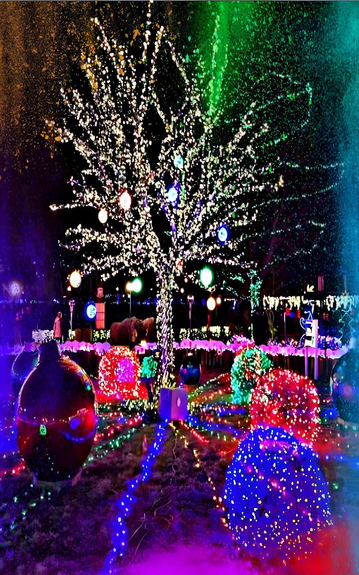 The image’s artistic style combines realistic lighting effects with a slightly dreamy, saturated color palette that emphasizes the warmth and excitement of holiday celebrations. The interplay of bright white lights with vibrant red, glowing green, and deep blue hues creates a visually stunning contrast that draws the eye across the entire scene. This wallpaper’s 4096×4096 resolution ensures crisp clarity and vivid colors, ideal for use on a variety of devices including desktops, laptops, tablets, and smartphones.