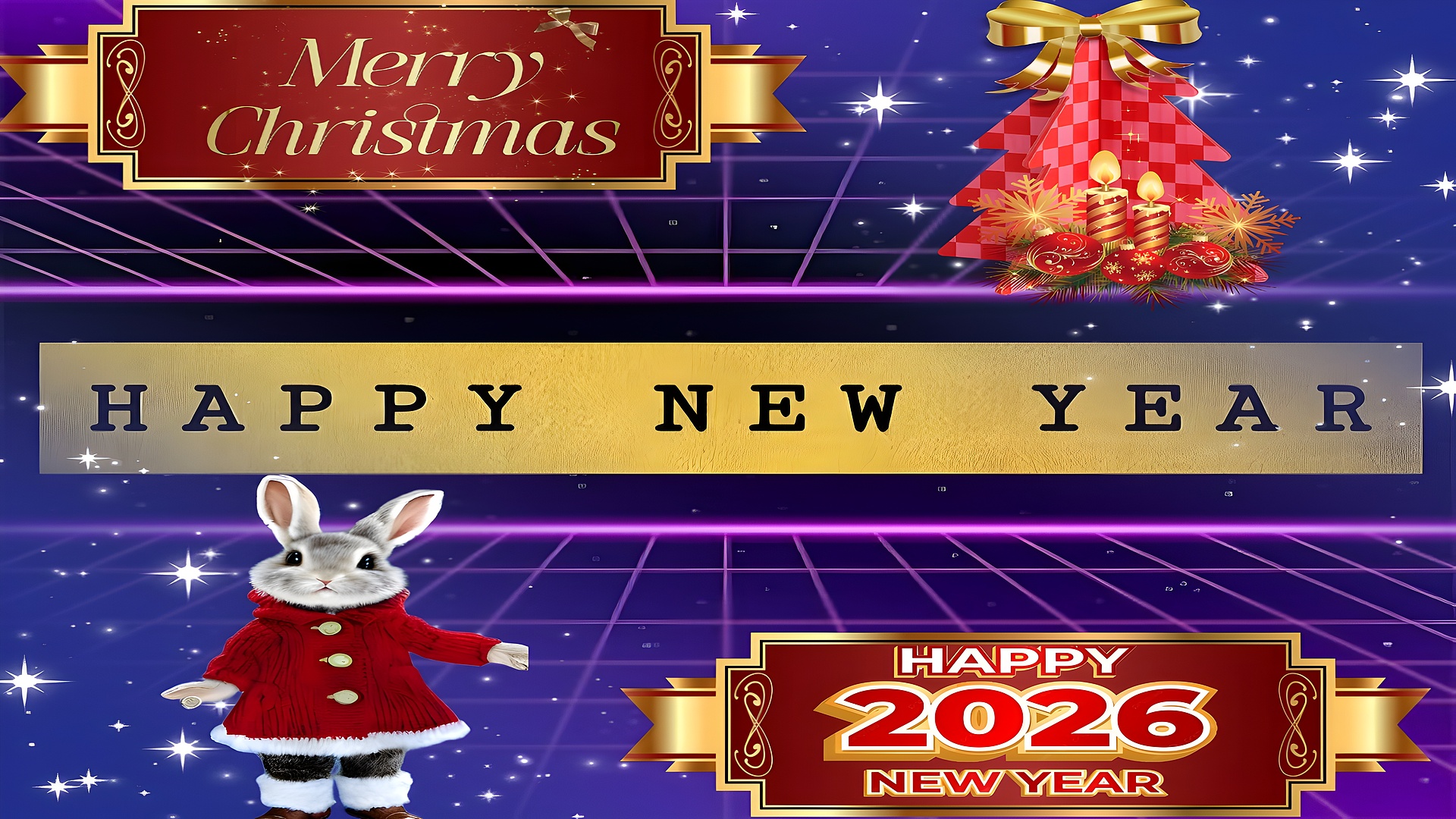 The wallpaper’s design is not just visually appealing but also encapsulates the spirit of the season. The bright red elements, including the rabbit's coat and the Christmas tree decorations, contrast beautifully against the deep blue backdrop, while the golden text wishing a "Happy New Year" adds a touch of elegance. This combination of colors creates a joyful and inviting atmosphere, perfect for celebrating the end of one year and the beginning of another.